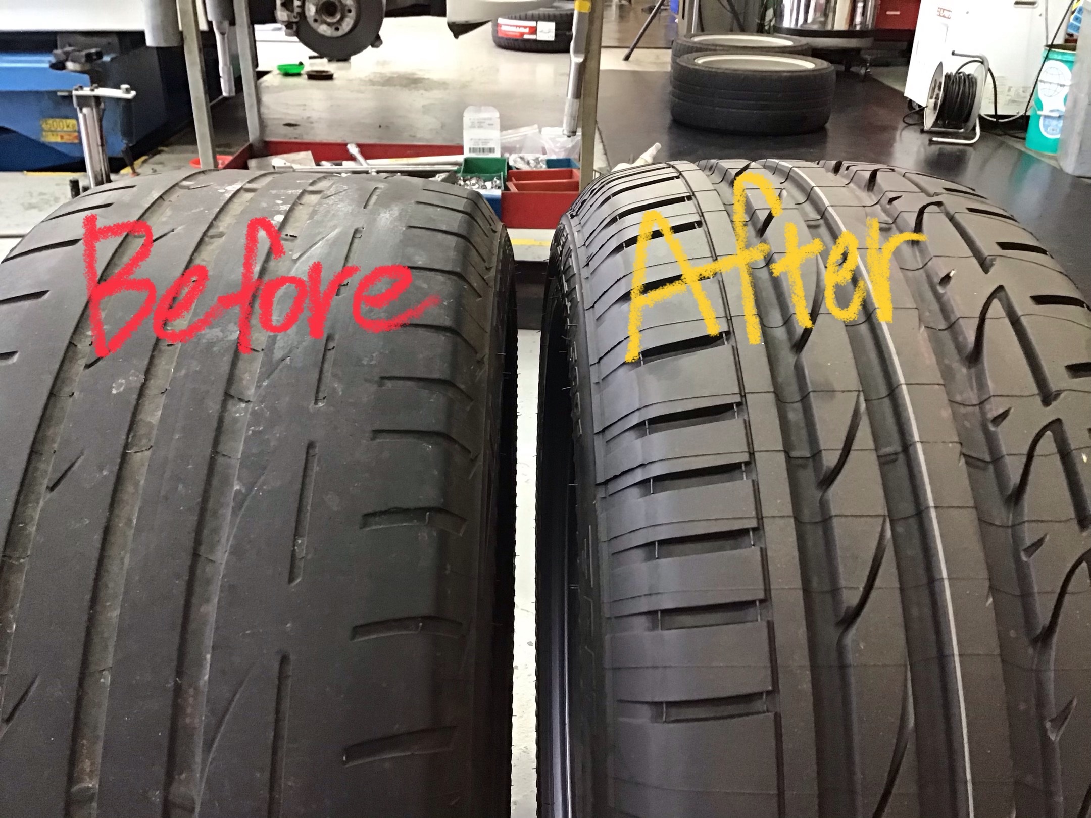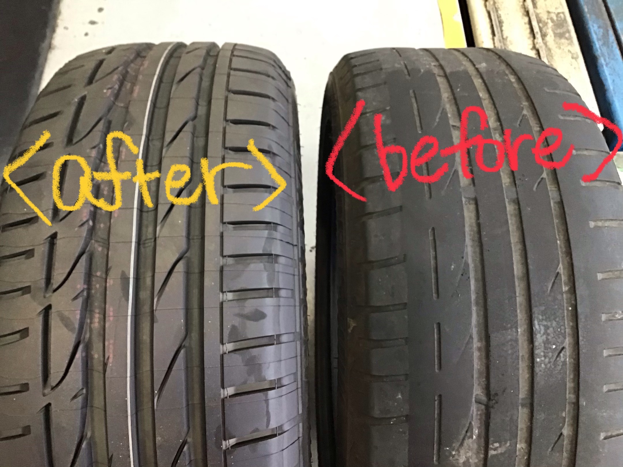 ←新品タイヤ 旧タイヤ→