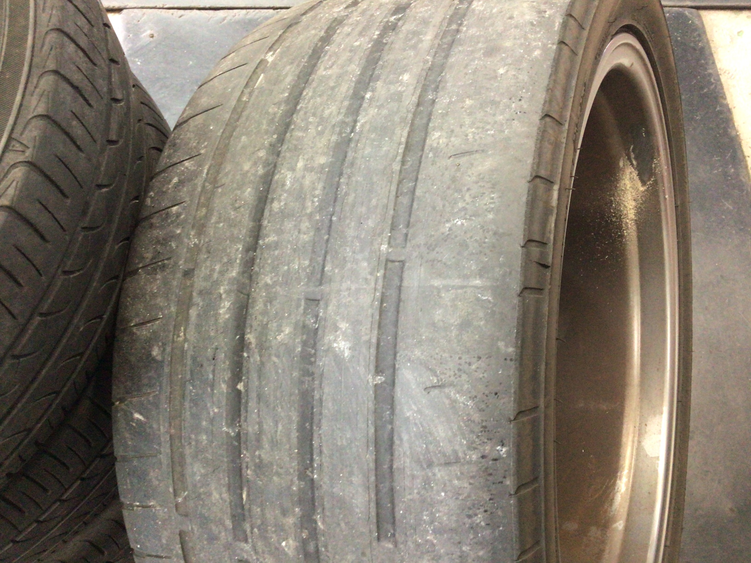 画像は交換する前のタイヤです。若干内べりしています。定期点検時に指摘されるまで、運転していて気がつかなかったそうです。トラブルが起こる前でよかったです。