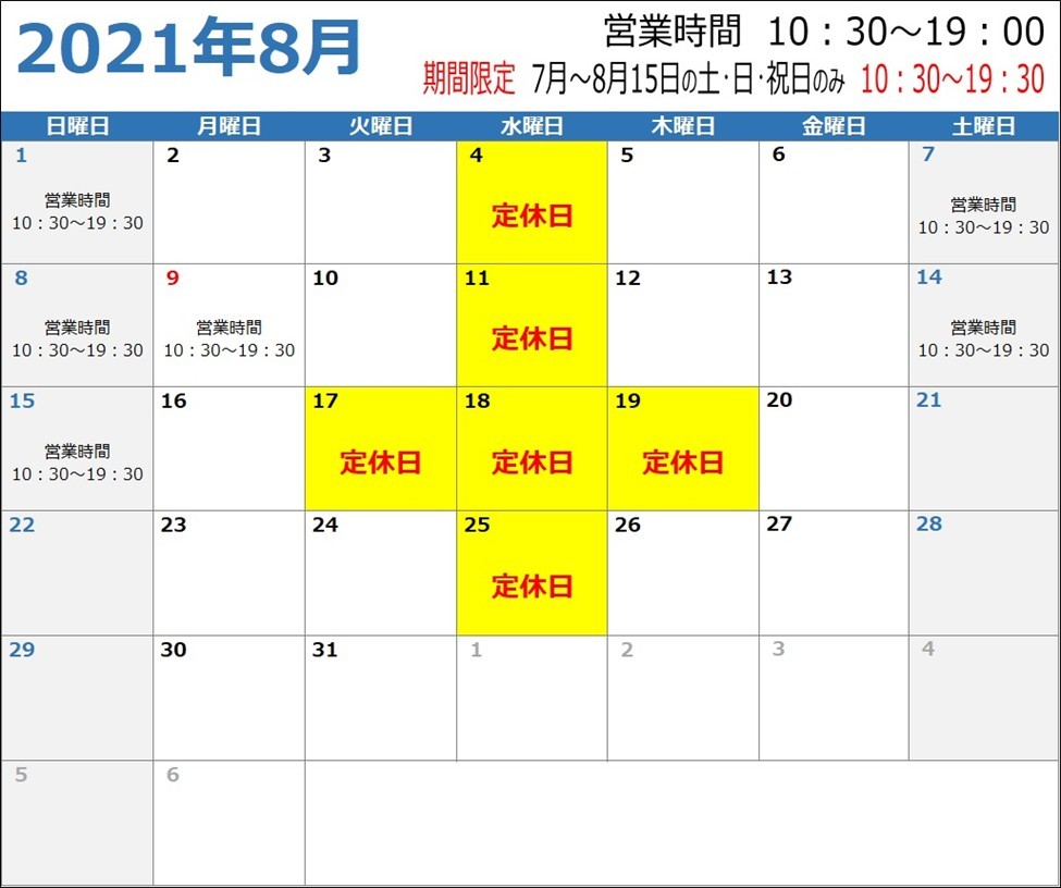 2021年8月の定休日は
