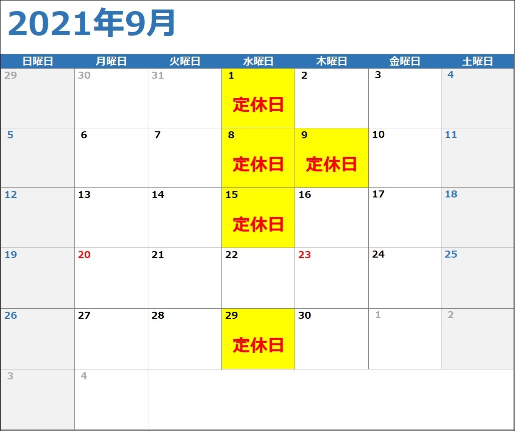 2021年9月の定休日は