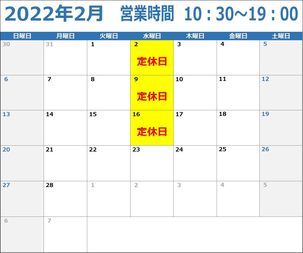 ☆2022年2月定休日のお知らせ☆
