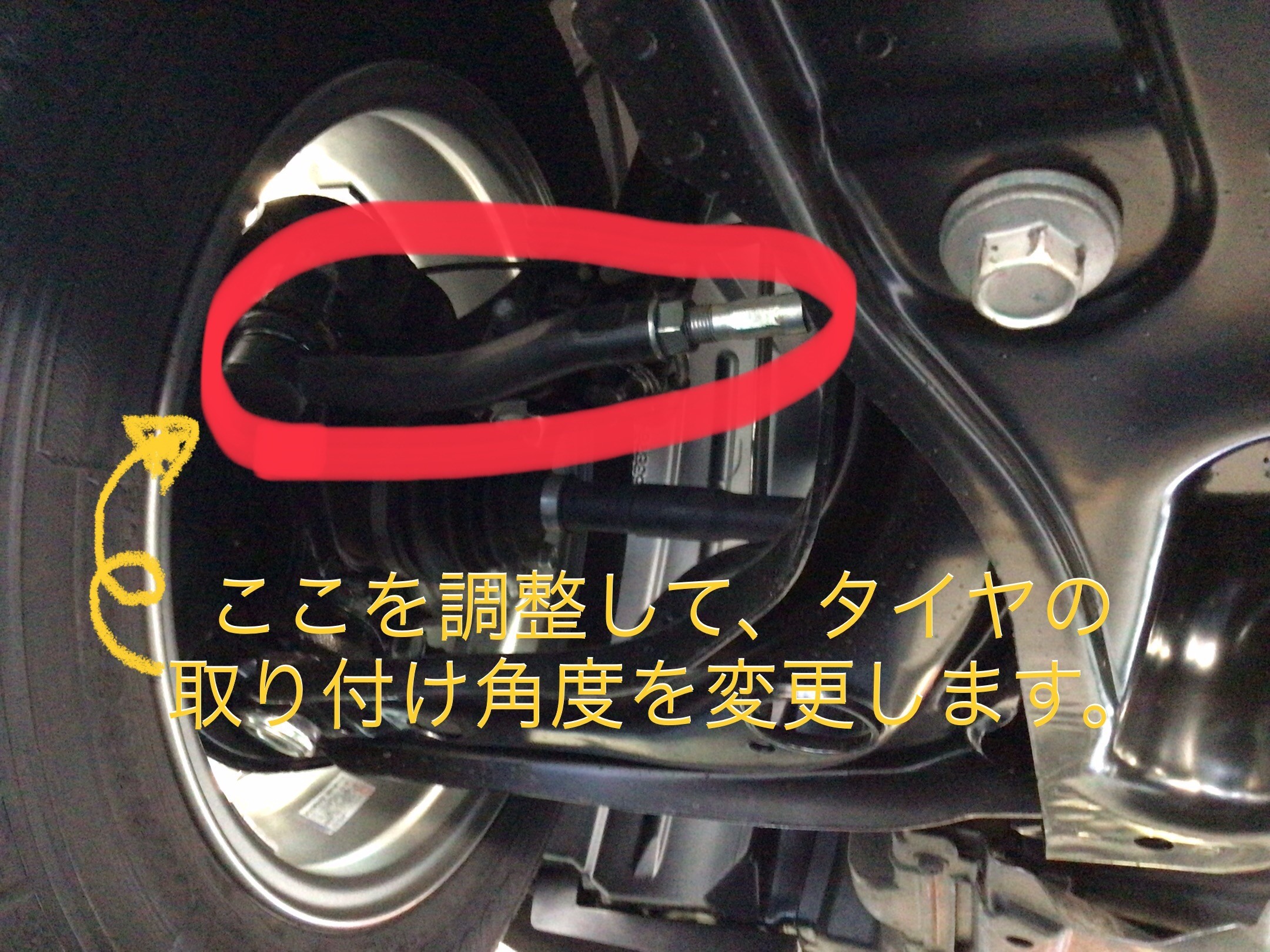 このアームの長さを変えることで、タイヤの取り付け角度を基準値へと調整します。
