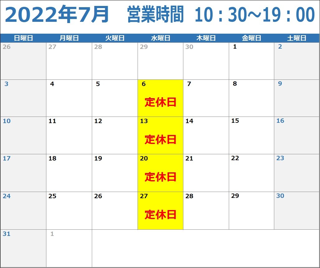 2022年7月の定休日は