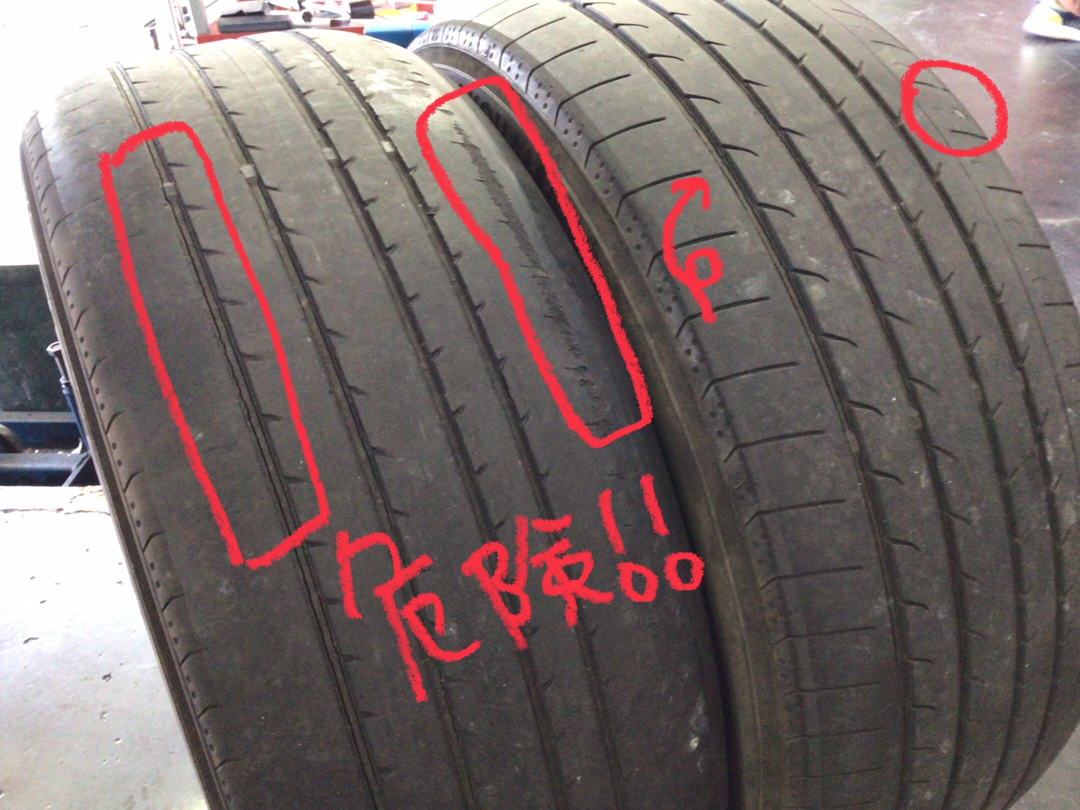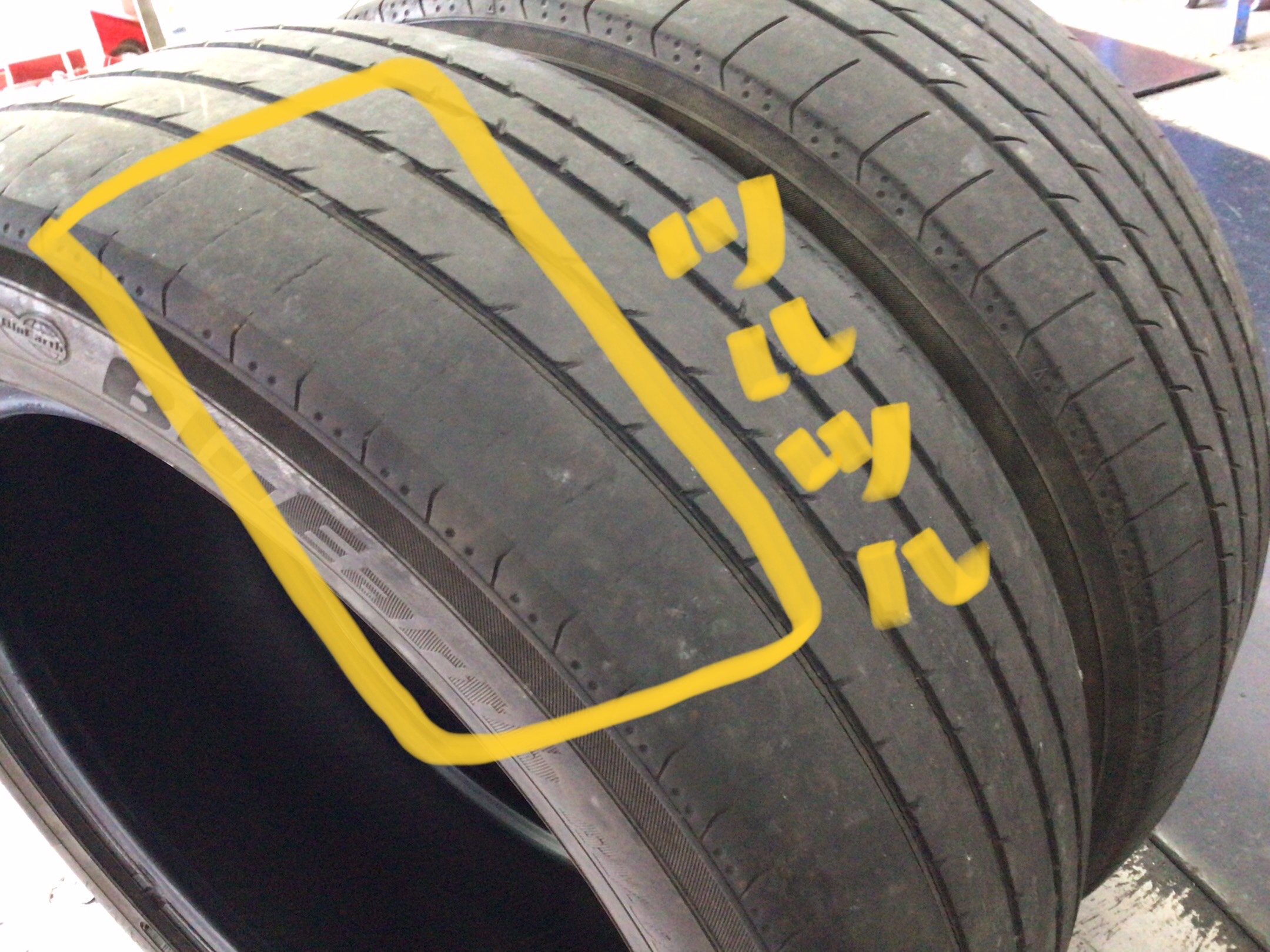 写真右側がリア装着タイヤ