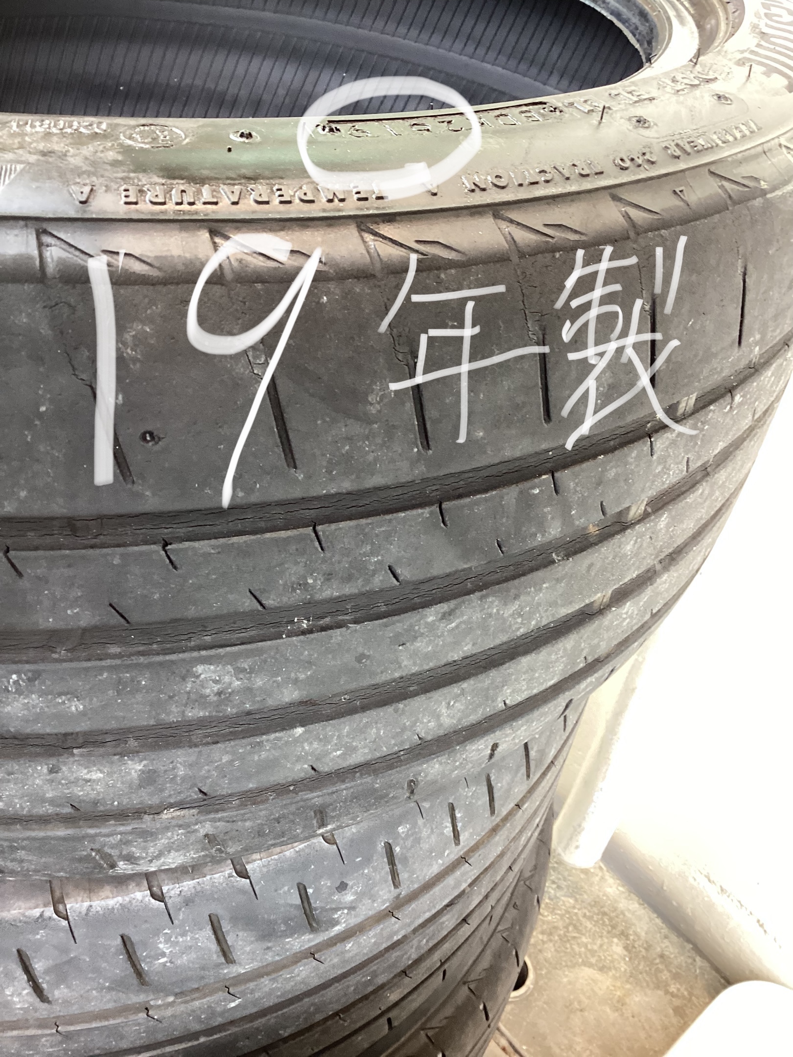 2019年製ですがスリップサイン(溝の間にある凸)、ヒビ