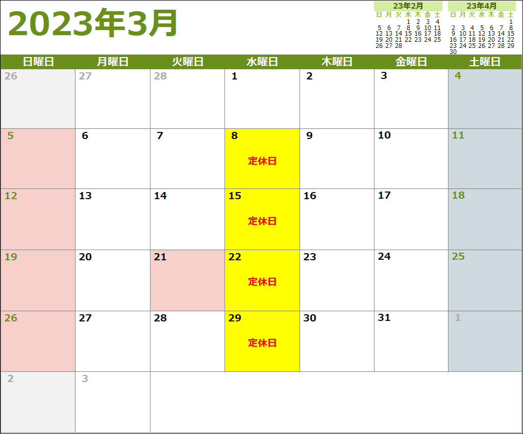 2023年3月の定休日は