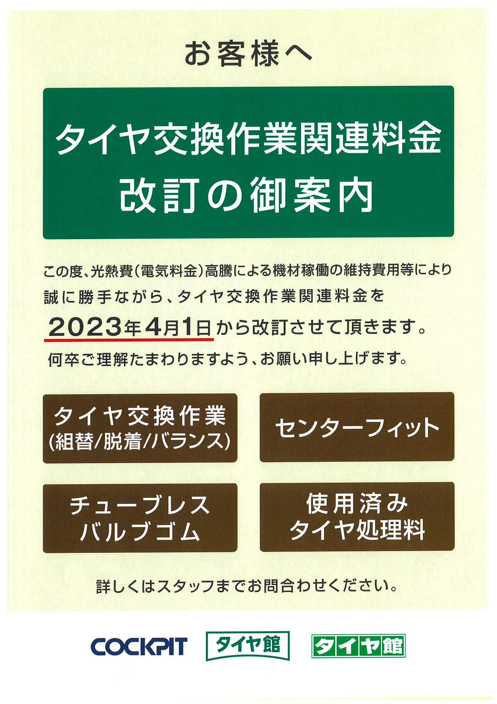 4/1~工賃の価格改定のお知らせです。