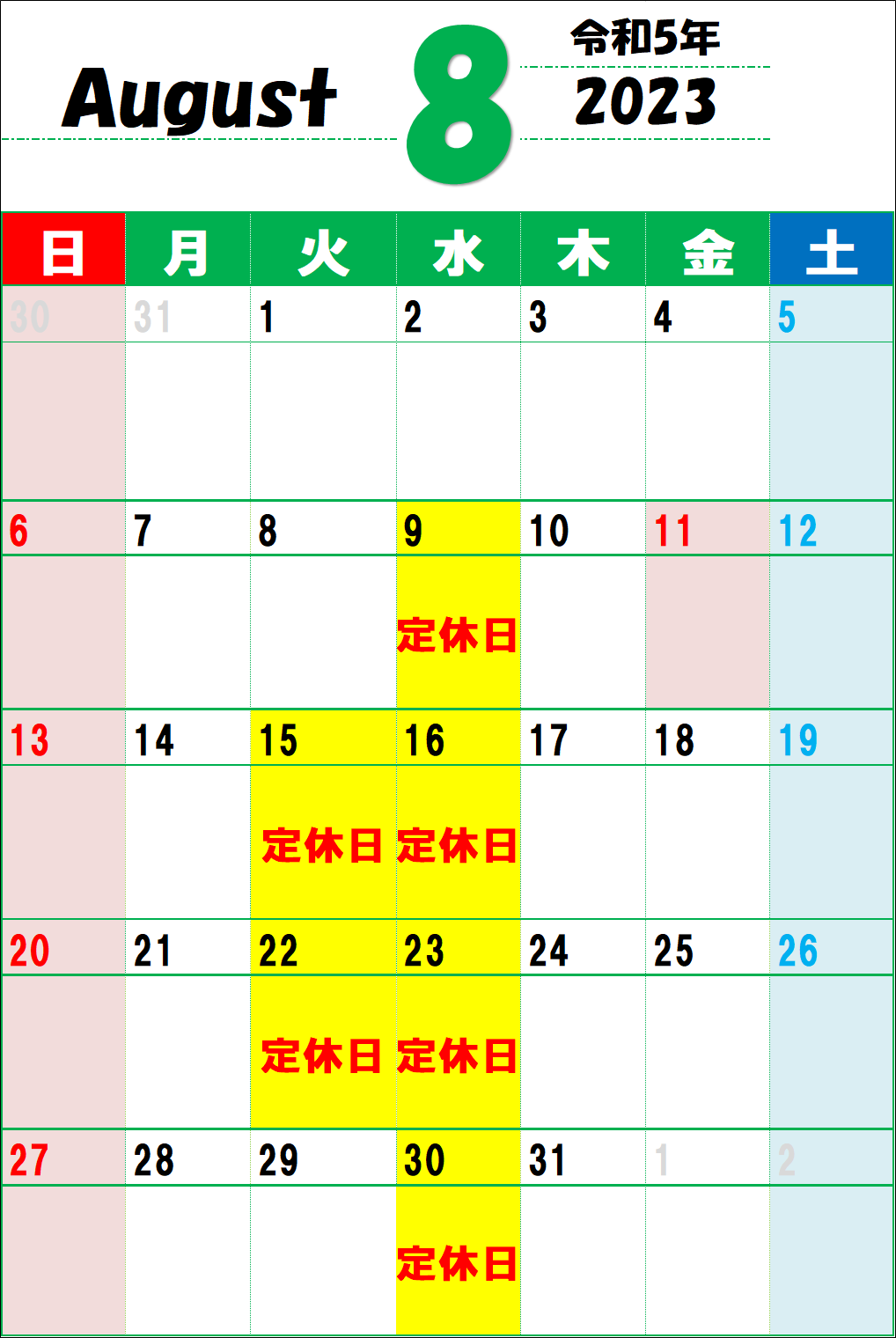 2023年8月の定休日は