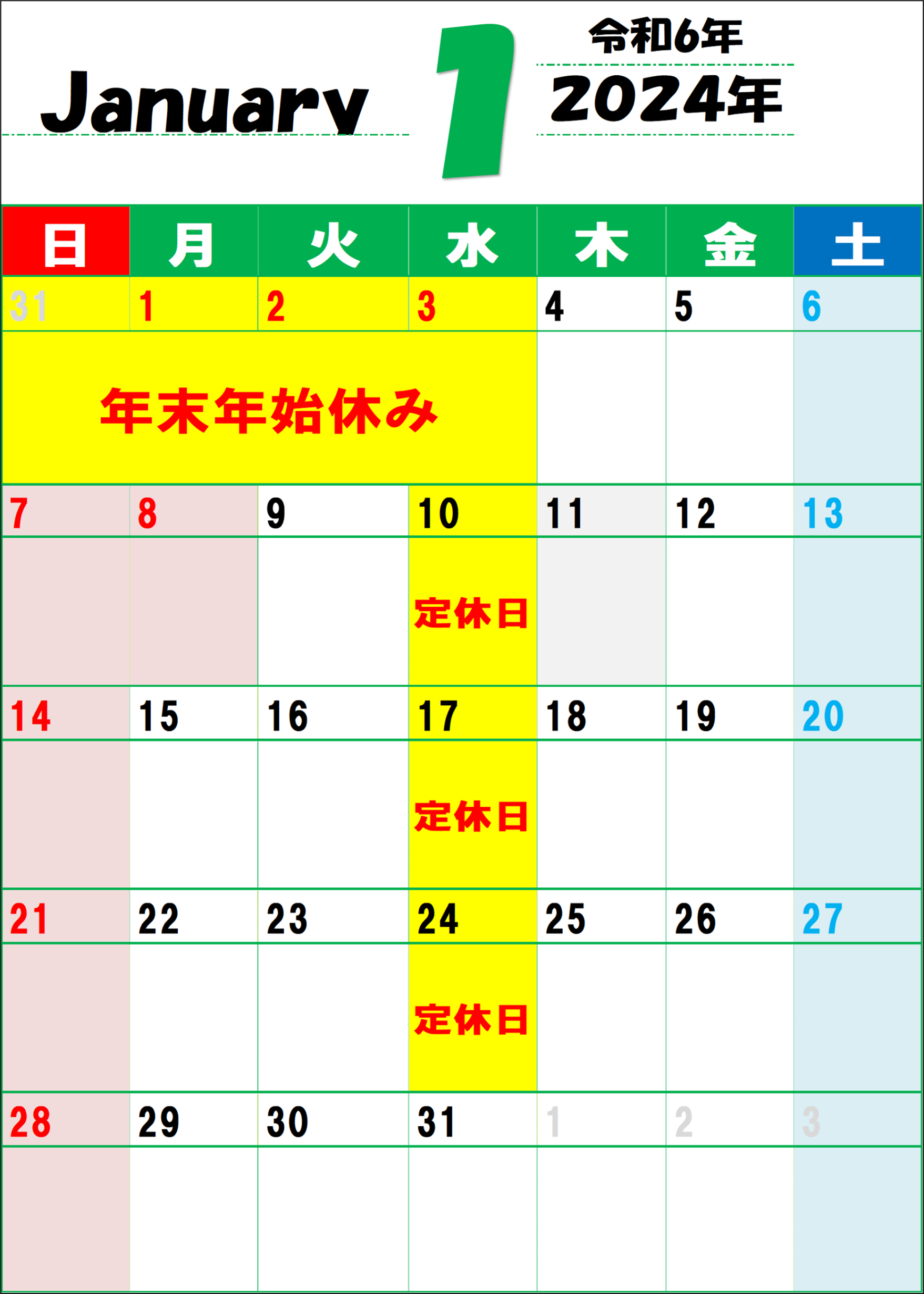 ▼2024年1月の定休日は
