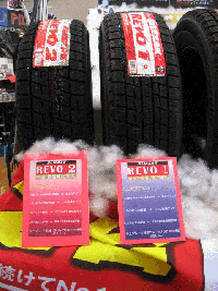 ③今年のブリザックラインナップ。プレミアムスタッドレス:REVO2とメジャースタッドレス:REVO1です。好評発売中です。