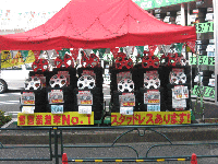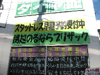 ①店舗側面大型メッセージPOPです。「関越乗るならブリザック!」。当店関越道の真下の店舗ため、東京が降雪なくても地方が雪予報出ると一気にスタッドレスタイヤが売り切れます。ご用意はお早めに!