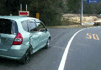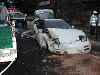 ③高速走行中に前輪がパンク(バースト:破裂)して制御不能になった車です。こうなると一発廃車ですネ。