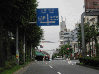 ①目白通りを大泉インター方面より直進します。前方に見える緑色の橋桁は、関越自動車道です。少し先に、比丘尼(びくに)交差点があります。