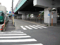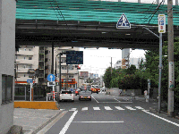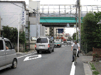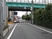 ①土支田通り(68号)を目白通りに向かっていくと、前方上に関越道の緑色の橋桁が見えてきます。