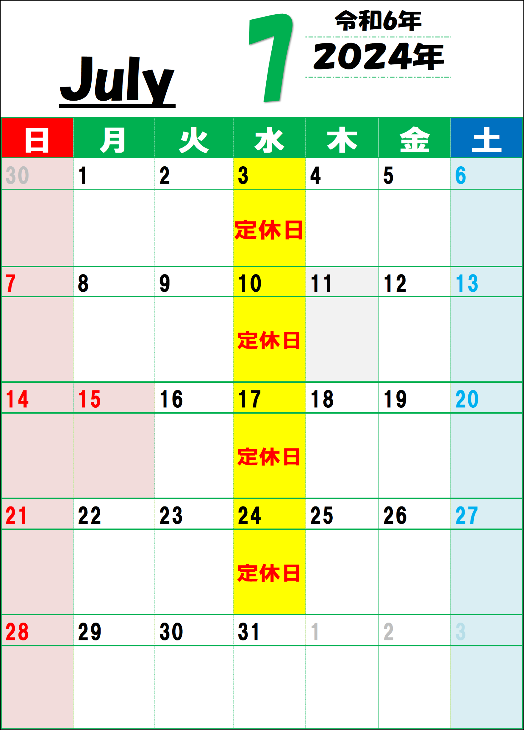 ▼2024年7月の定休日は