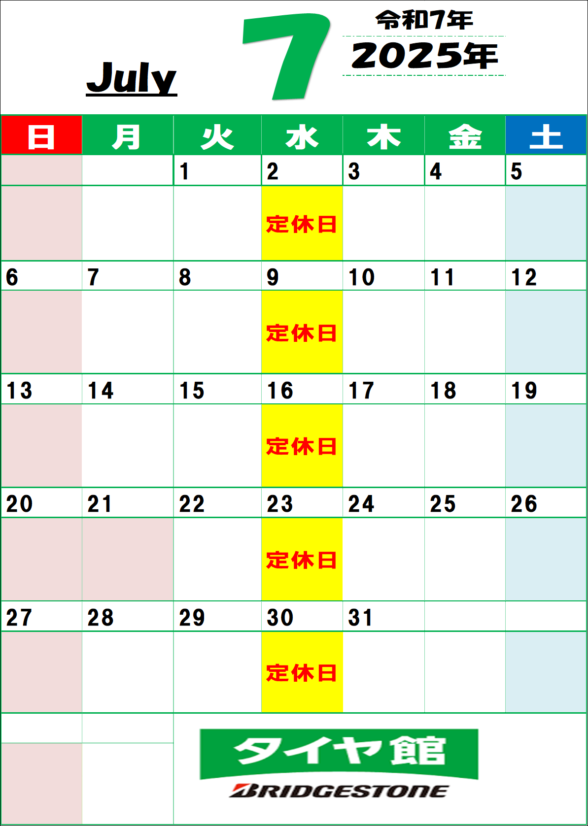 ▼2025年7月の定休日は