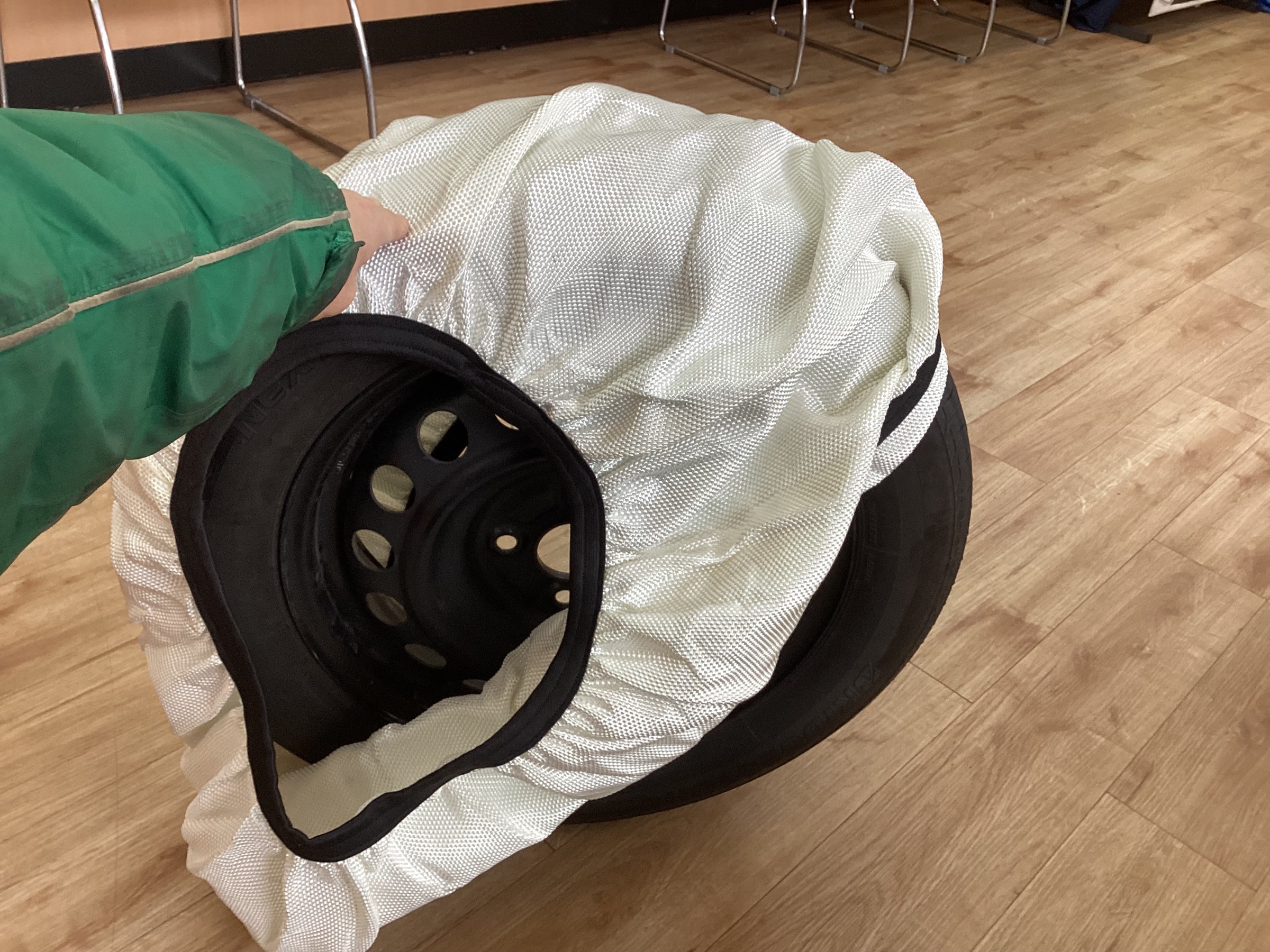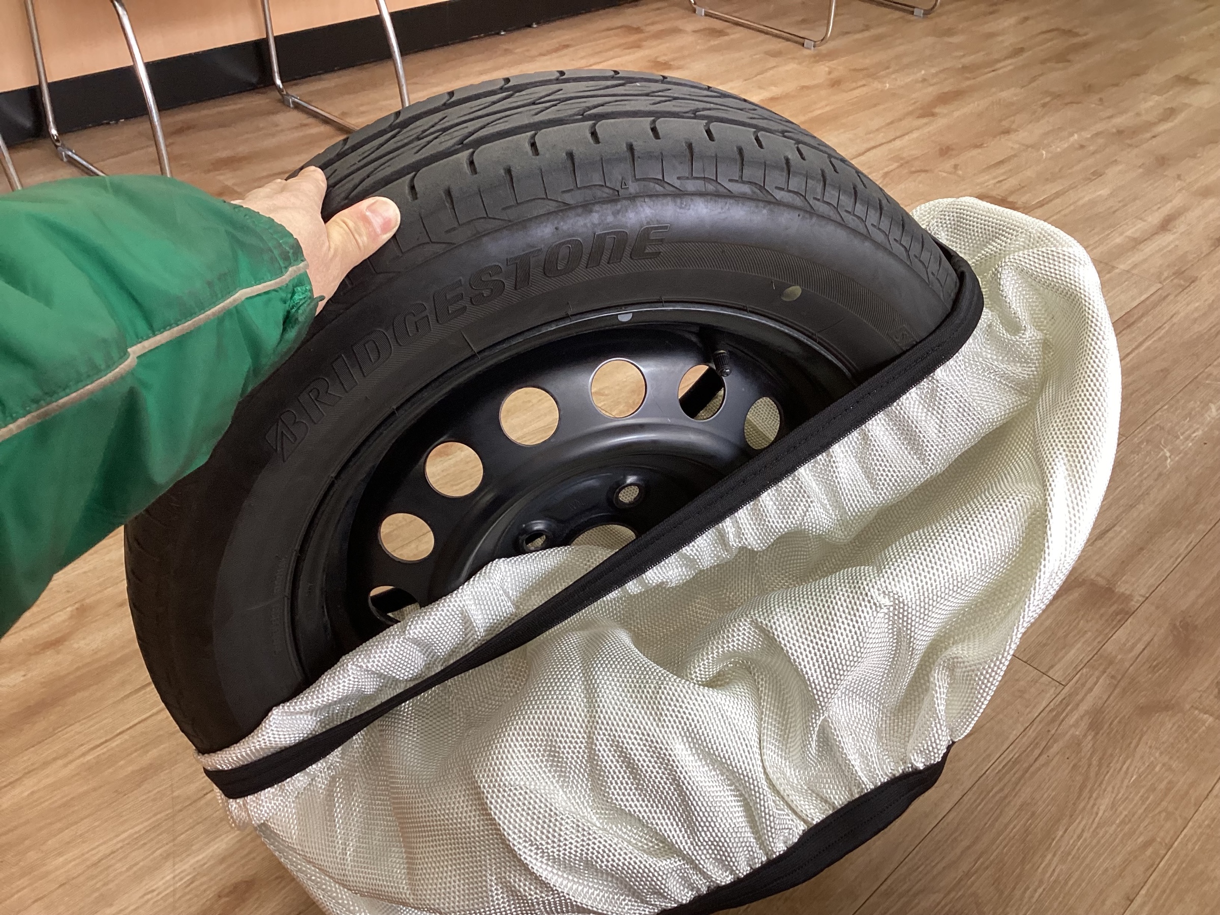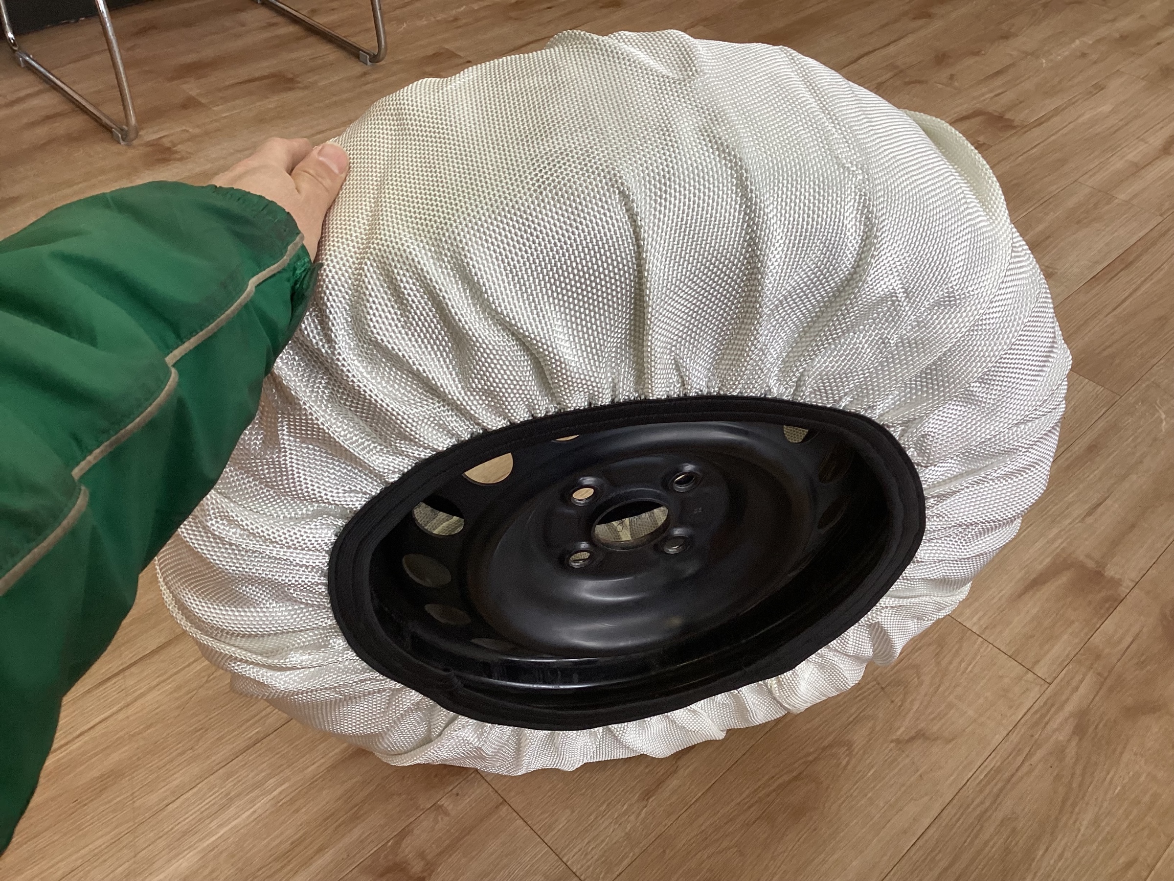 タイヤにスノーソックスを被せる