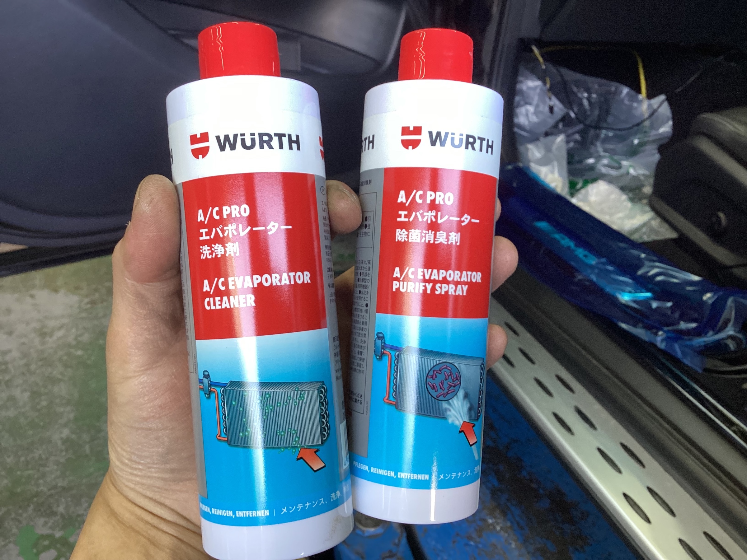 エバポレーター洗浄剤で汚れを落とし、エバポレーター除菌消臭剤で菌をやっつけます( `ー´)ノ