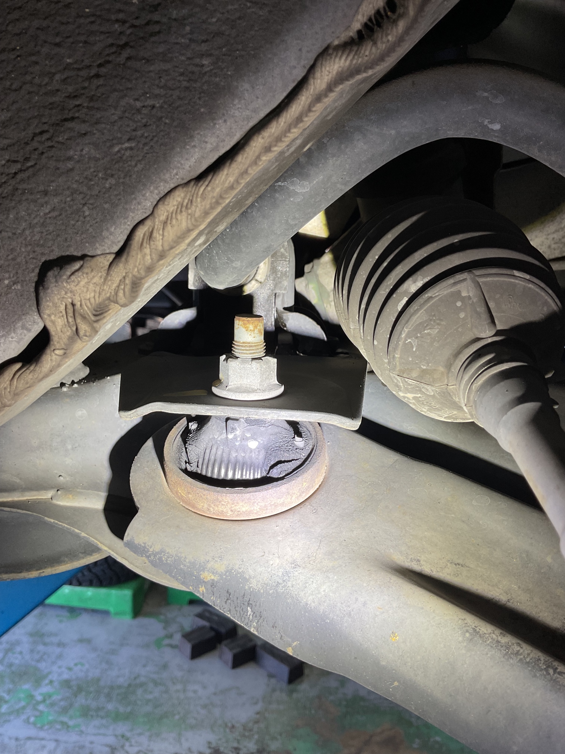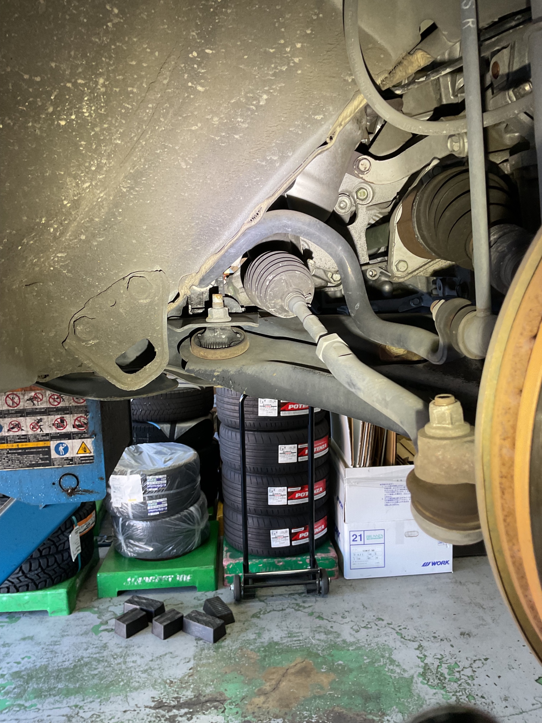 車をウィ~ンと上げて、タイヤ・ホイールを外すと、普段は見えないところが見えます
