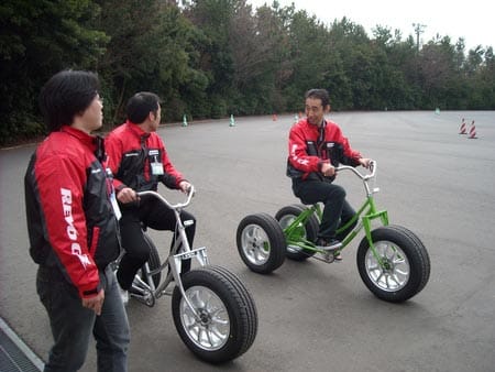 先ずは、エコピアを履いた3輪車と旧品の3輪車を乗って体感します。