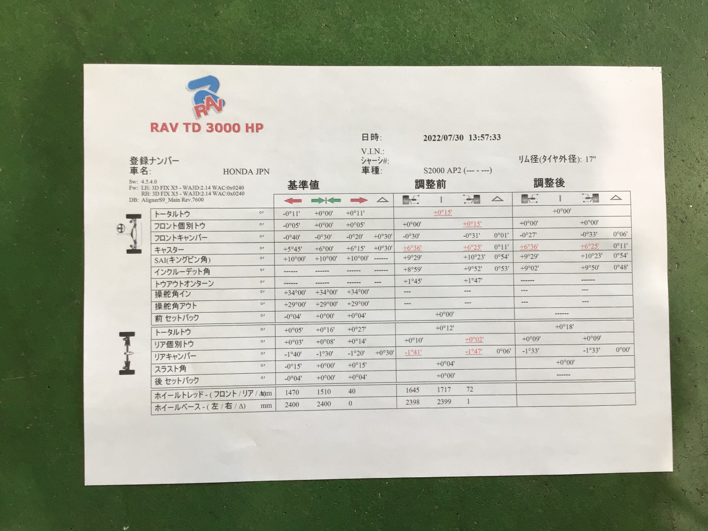 ホンダ S2000 タイヤ4本交換 アライメント調整作業