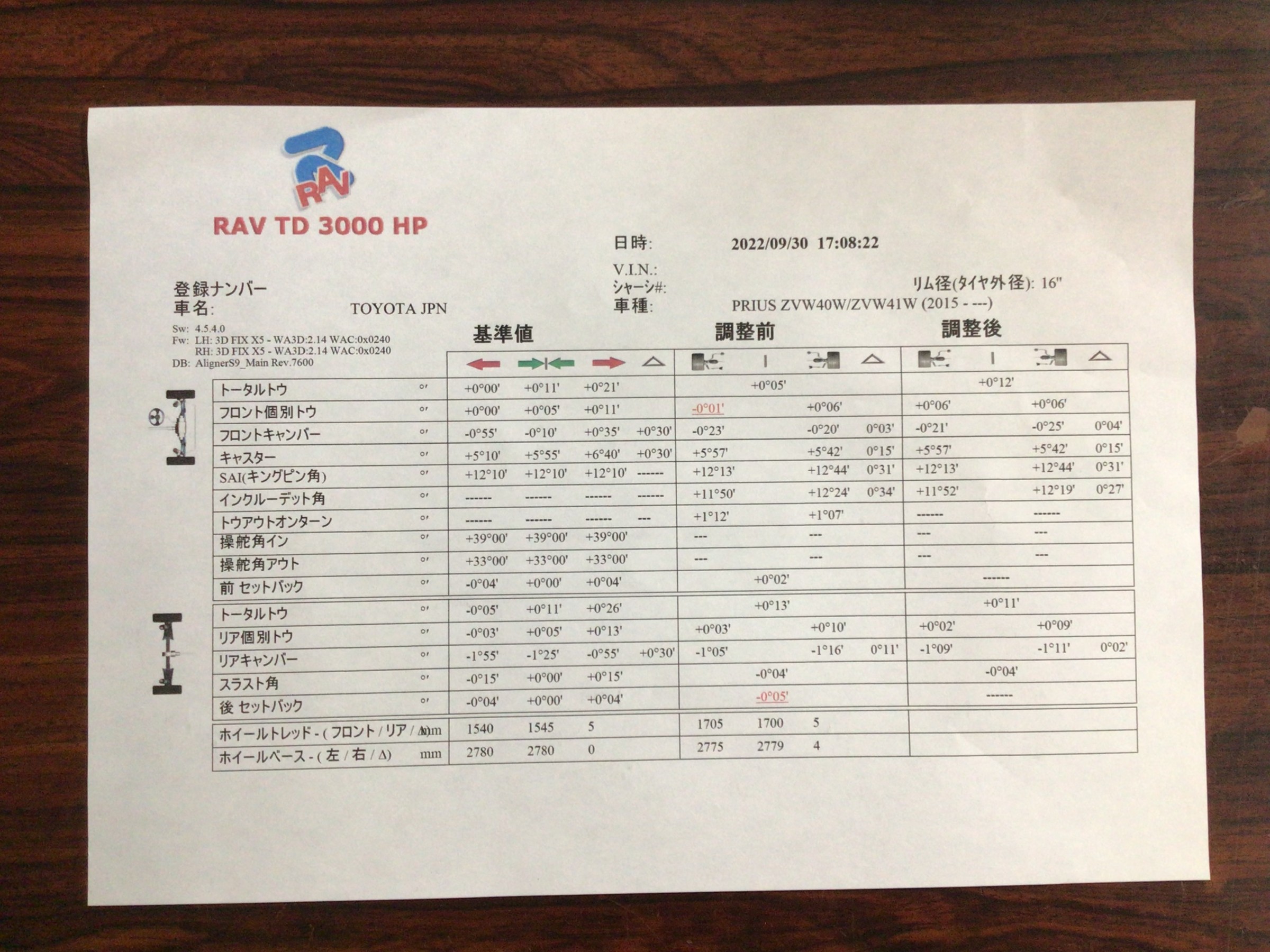 やはり、車高調を取り付けるとアライメントが大きくズレてきます。