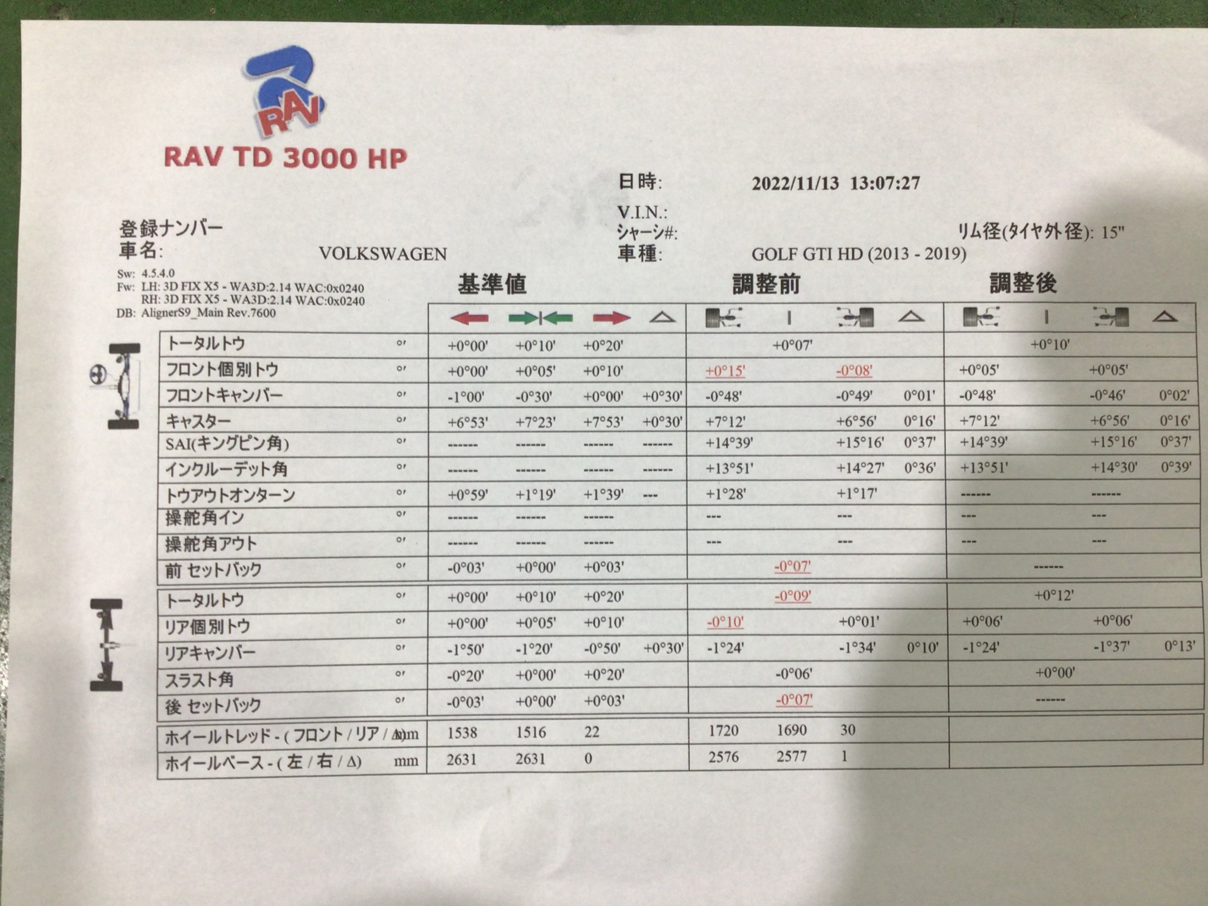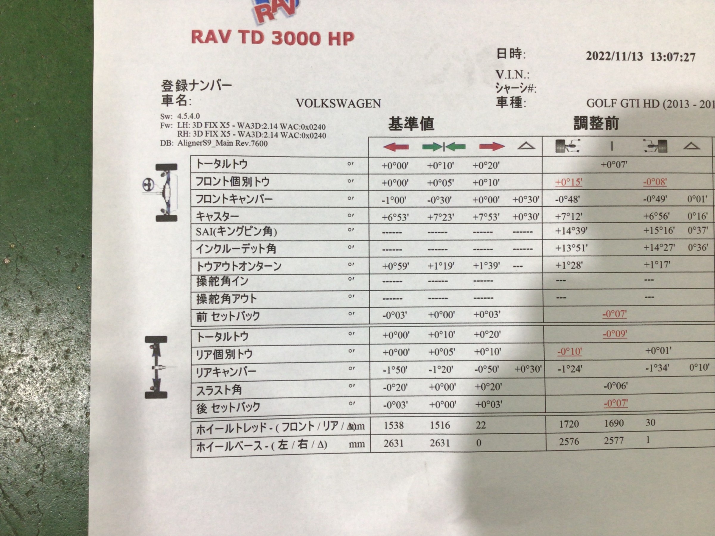 本日は、フォルクスワーゲン ゴルフのタイヤ交換・アライメント調整作業のご紹介です!