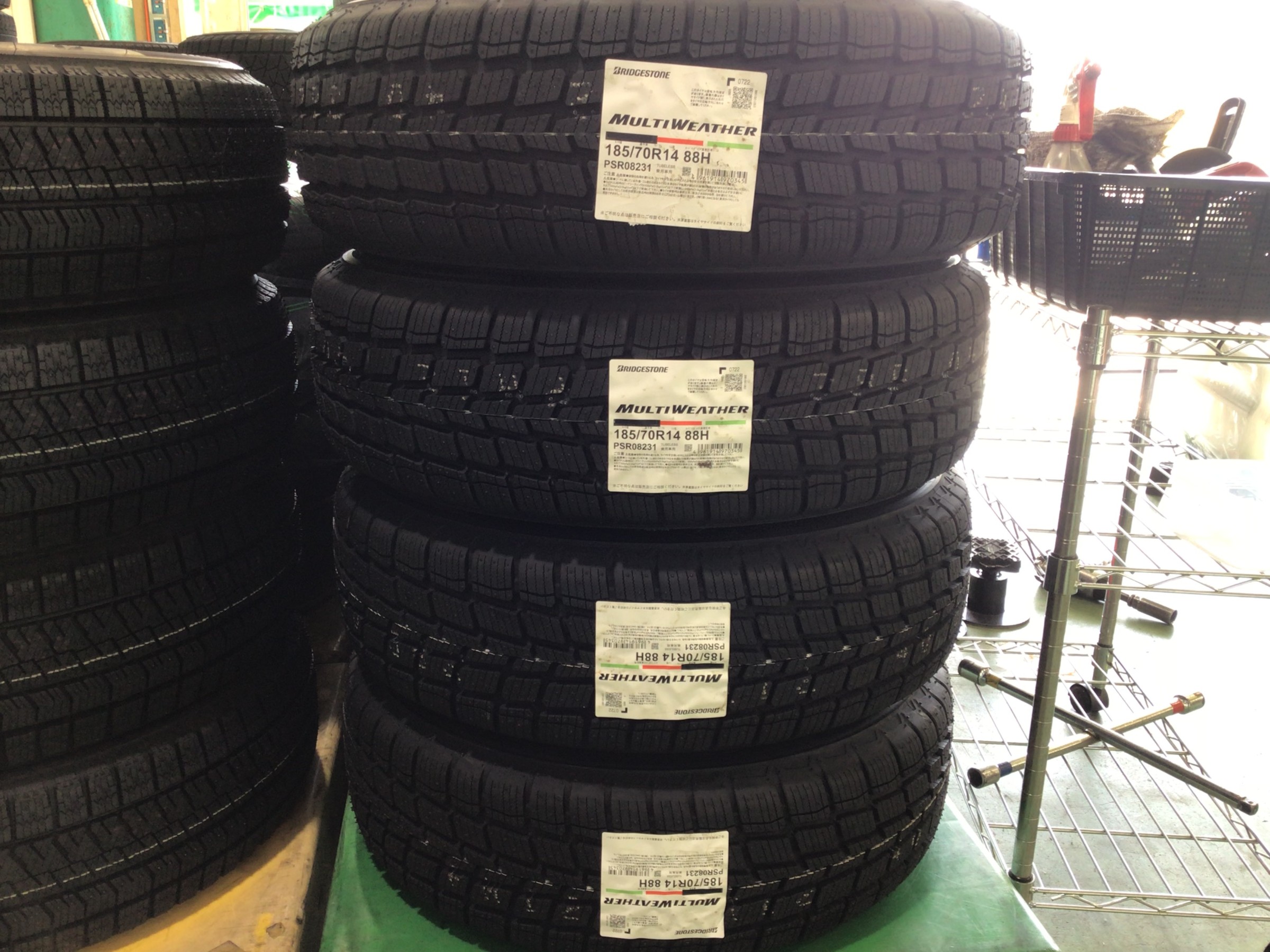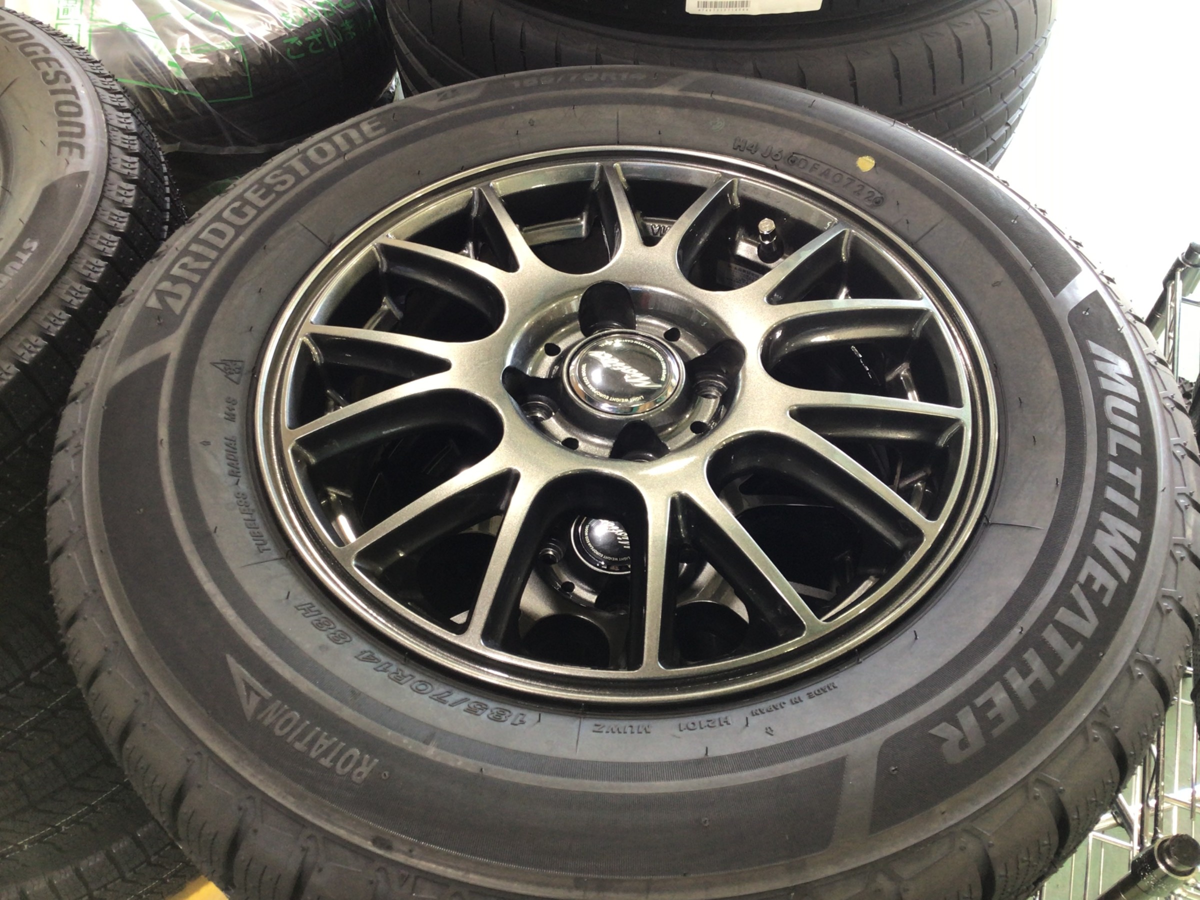 今回はスタッドレスタイヤが付いていたホイールにオールシーズンタイヤを組み付けて取付です。