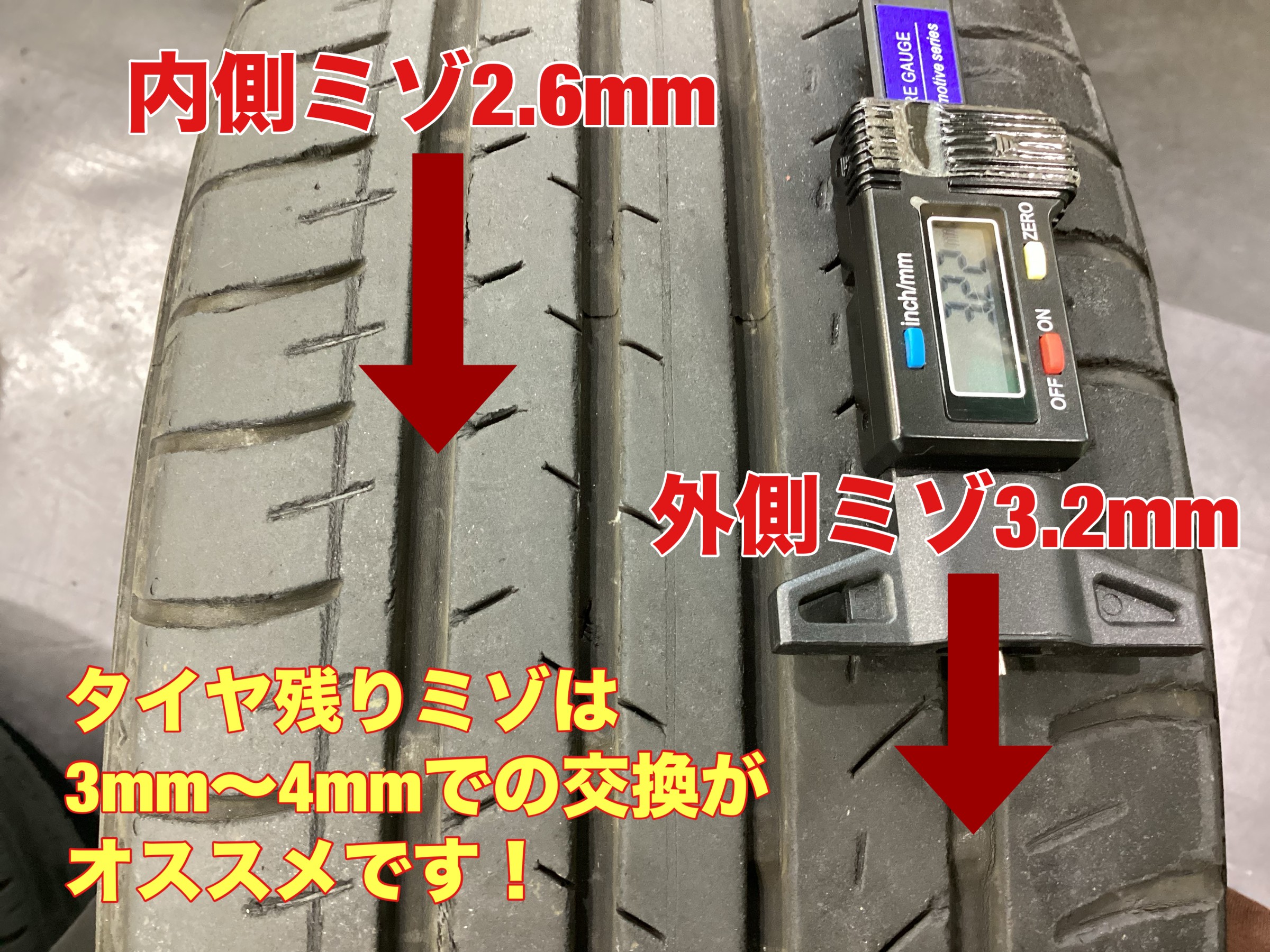 タイヤの残りミゾが3~4mmぐらいが