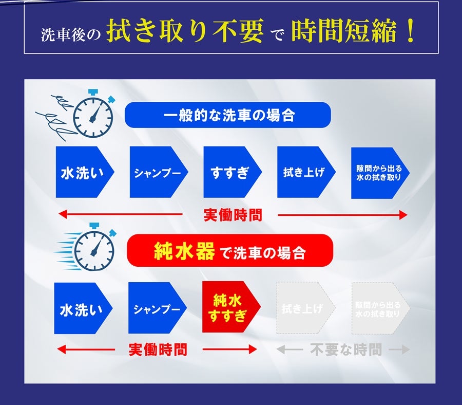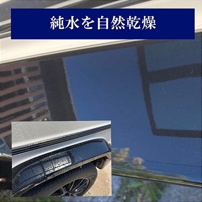 シャンプー後のすすぎで「純水」を使用すれば、その後のボディ拭き上げが不要。自然乾燥でOK。洗車がラクで洗車時間が大きく短縮できます。