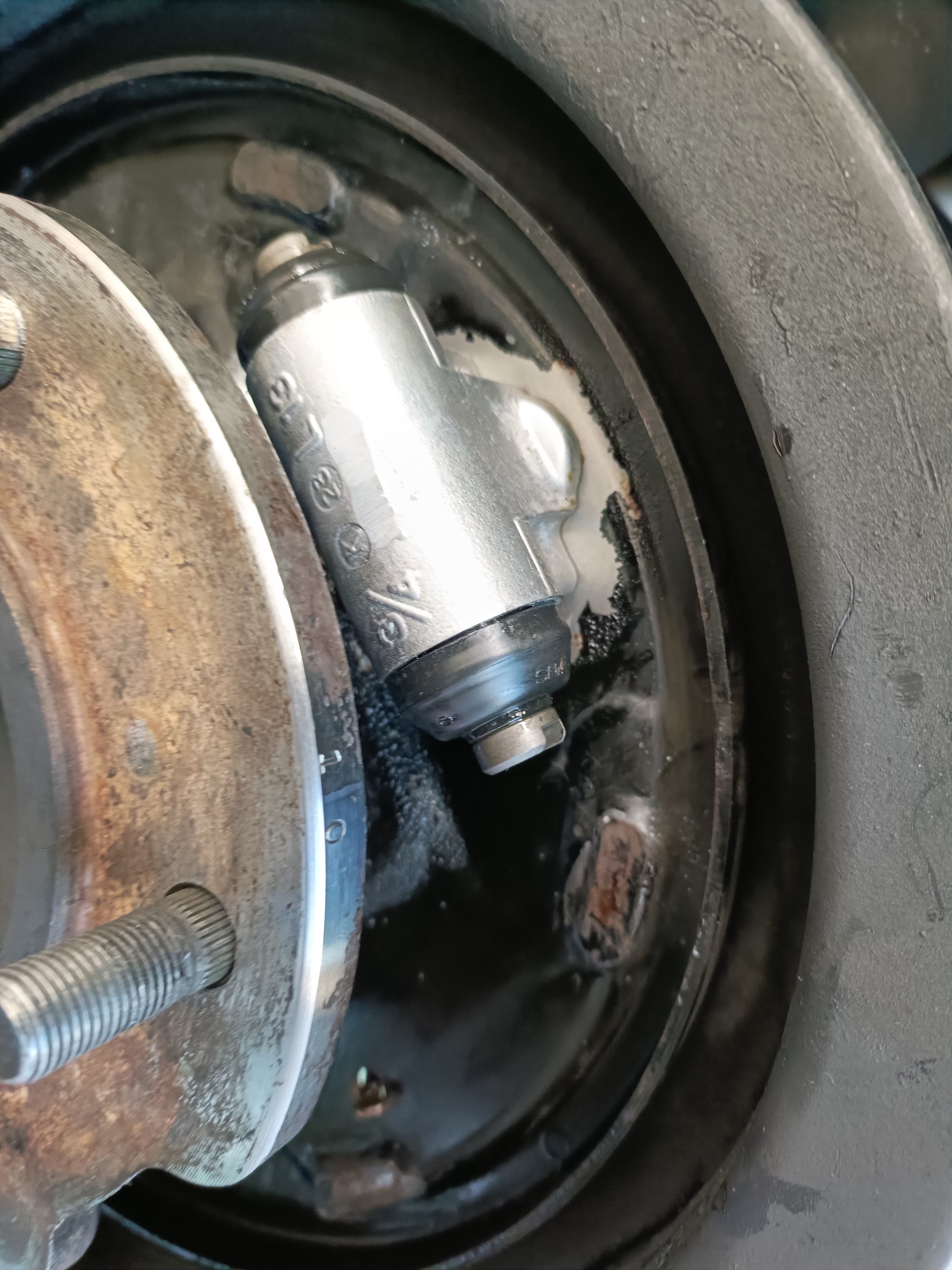 リヤブレーキドラムから異音と引っ掛かり感があるそうで、前日に一旦ドラムを外して確認したところ、左シリンダーからのフルード滲みが発生していました。ブレーキシューの摩耗もみられます。