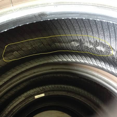 純正ランフラットタイヤの内側がひどい状態になってました。(写真の黄色の丸のところ)