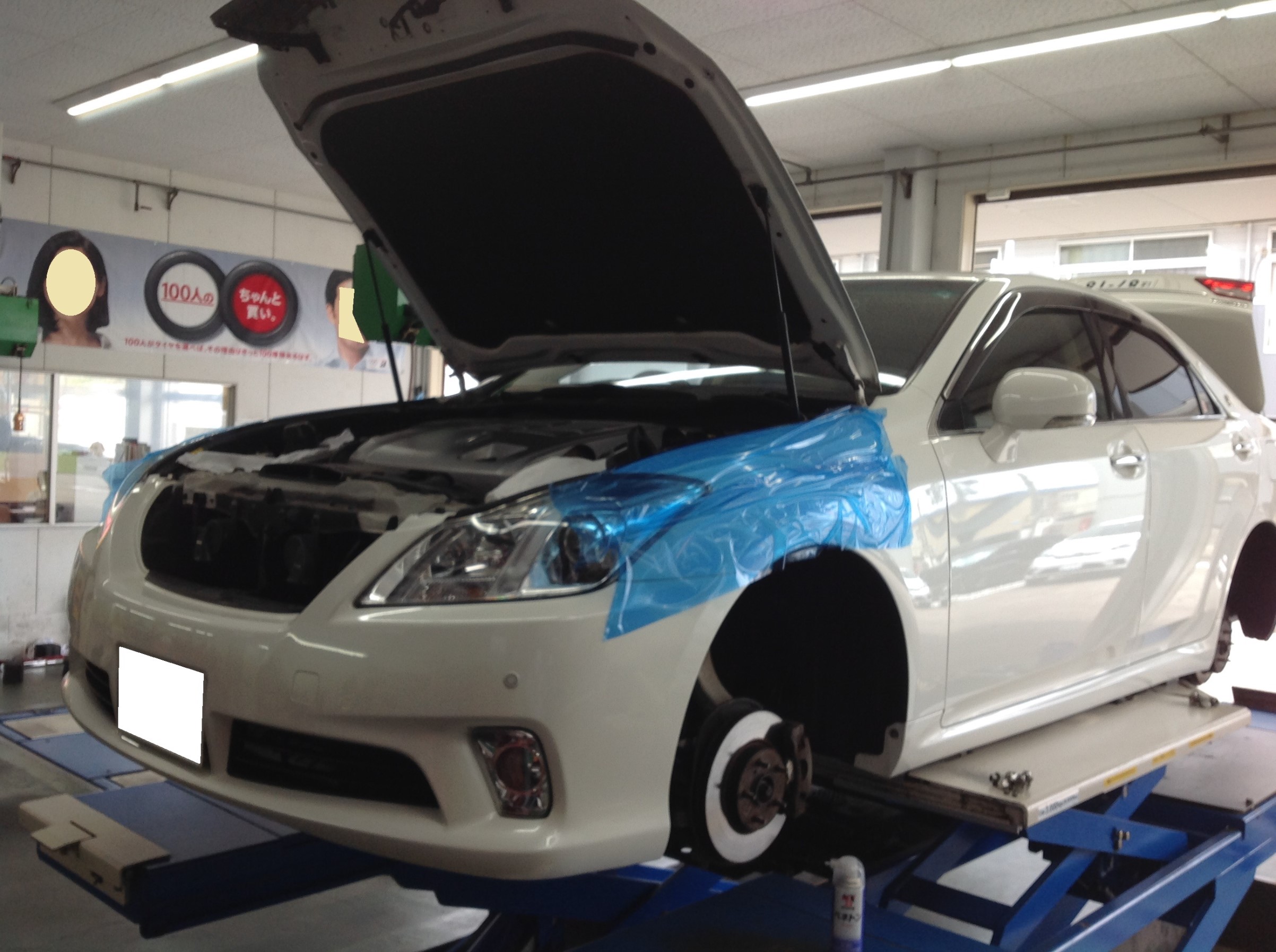 お客様の大切なお車に傷が付かぬように保護シートで養生しての作業です。