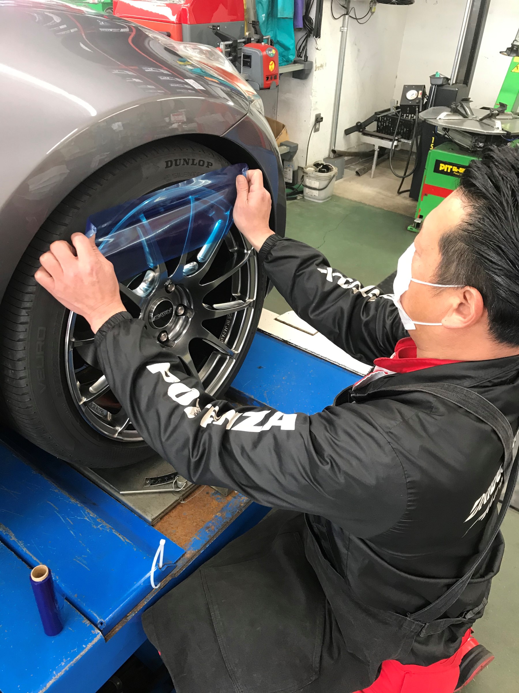 お客様の大切なお車ですのでアルミホイールに傷が付かない様「ブルーテープシート」で養生致します!