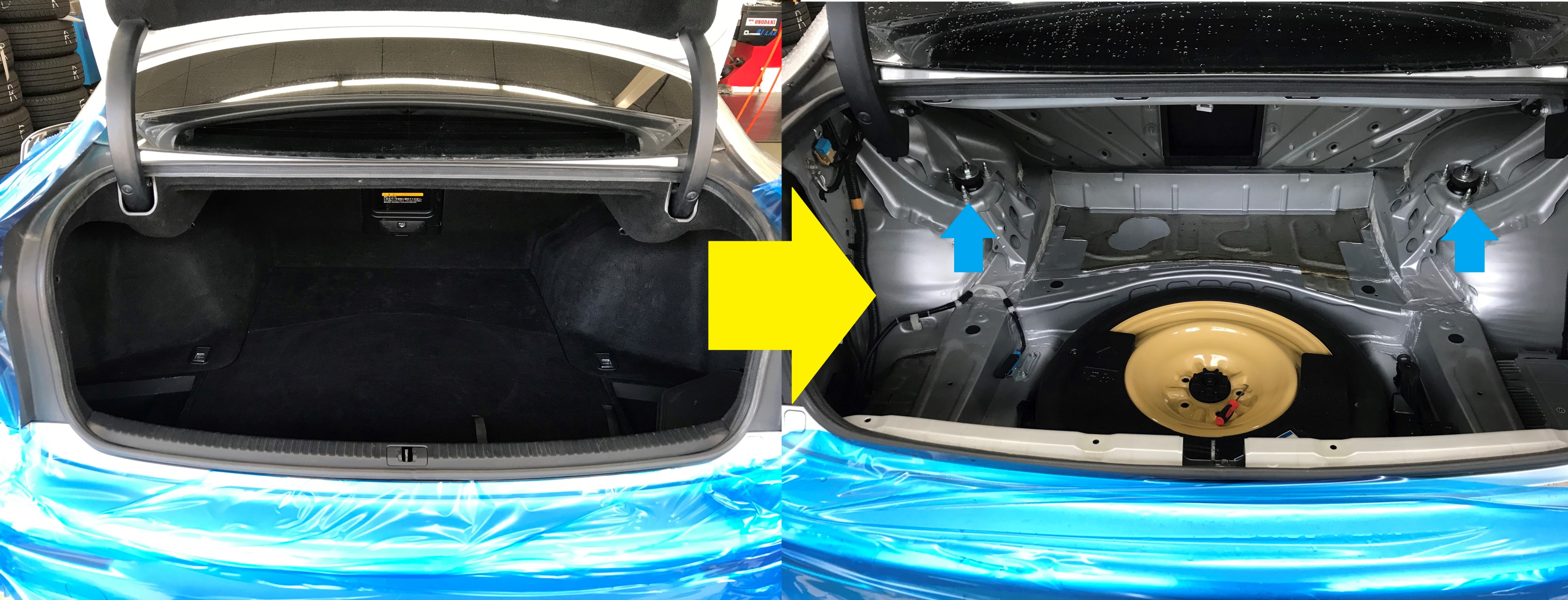 リアのアッパーはトランクルームから。内装を取り外してアクセスします。(^-^)