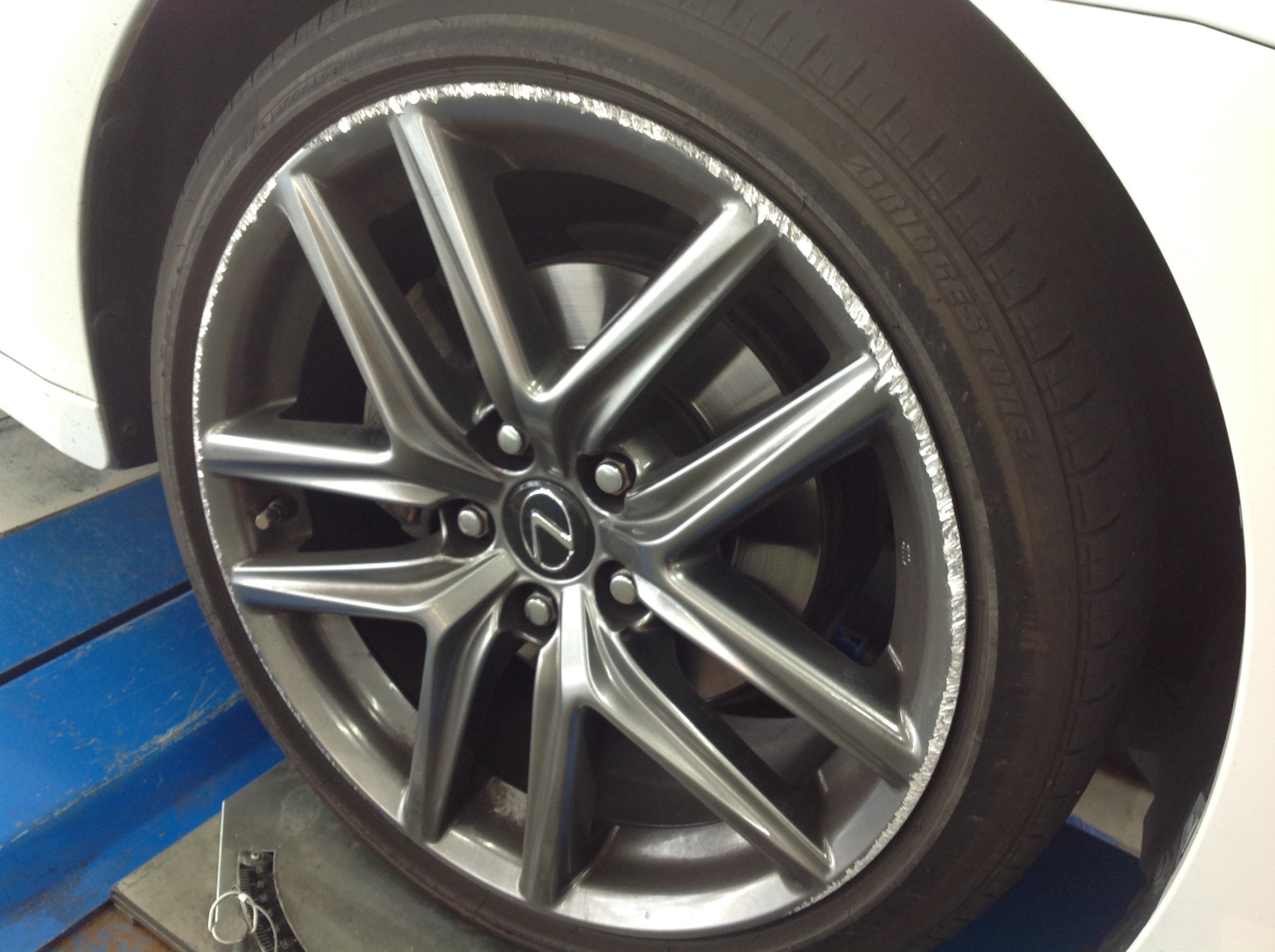 お客様よりご依頼がありました。お車の右前輪ホイールに真新しい「ガリ傷」が・・・。