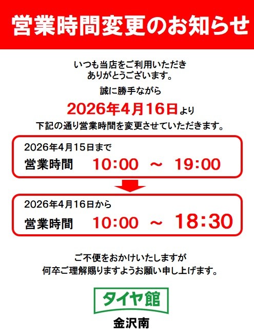 『タイヤ館金沢南』のホームページをご覧いただきありがとうございますm(__)m 石川県金沢市伏見台で今日も元気に営業中です! 先日(2月28日(土)~3月8日(日))開催させていただきました・・・ 2026年 春のタイヤ祭り『大商談会』 たくさんのお客様にご来店・お買い上げいただきまして大盛況でした! ...
