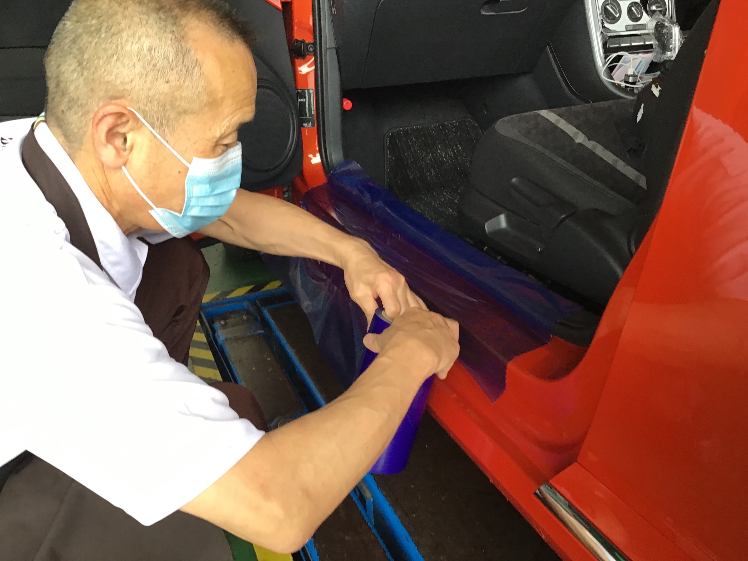 取り付け作業時にはどうしても作業中におクルマに体が触れるので養生もしっかり行います。