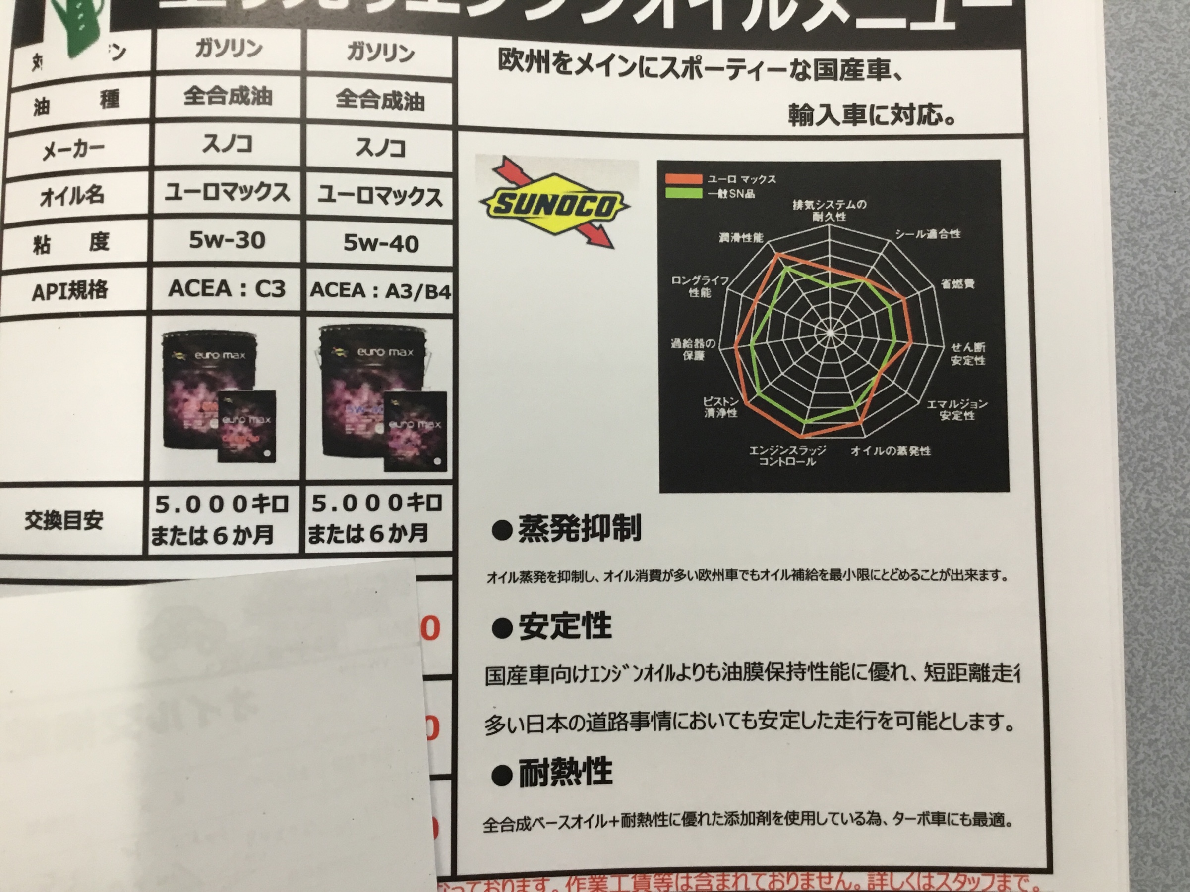 オイルは輸入車に最適な、スノコのユーロマックスです。