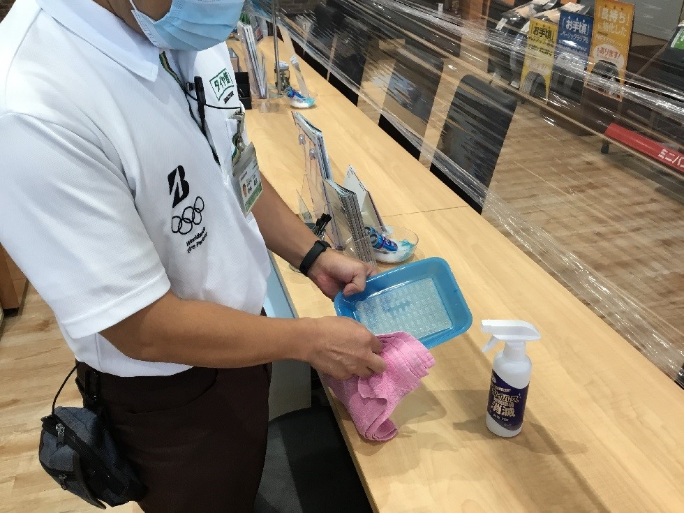 ↑ (金銭トレーの消毒、除菌 もちろんスタッフは手指の消毒をしたうえでの作業をしております。)