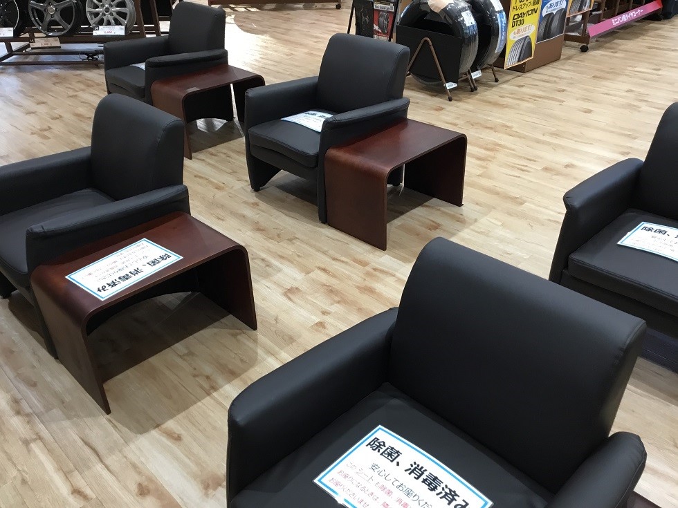 ↑ (除菌、消毒済みの椅子には分かりやすいよう案内表を置いております。)