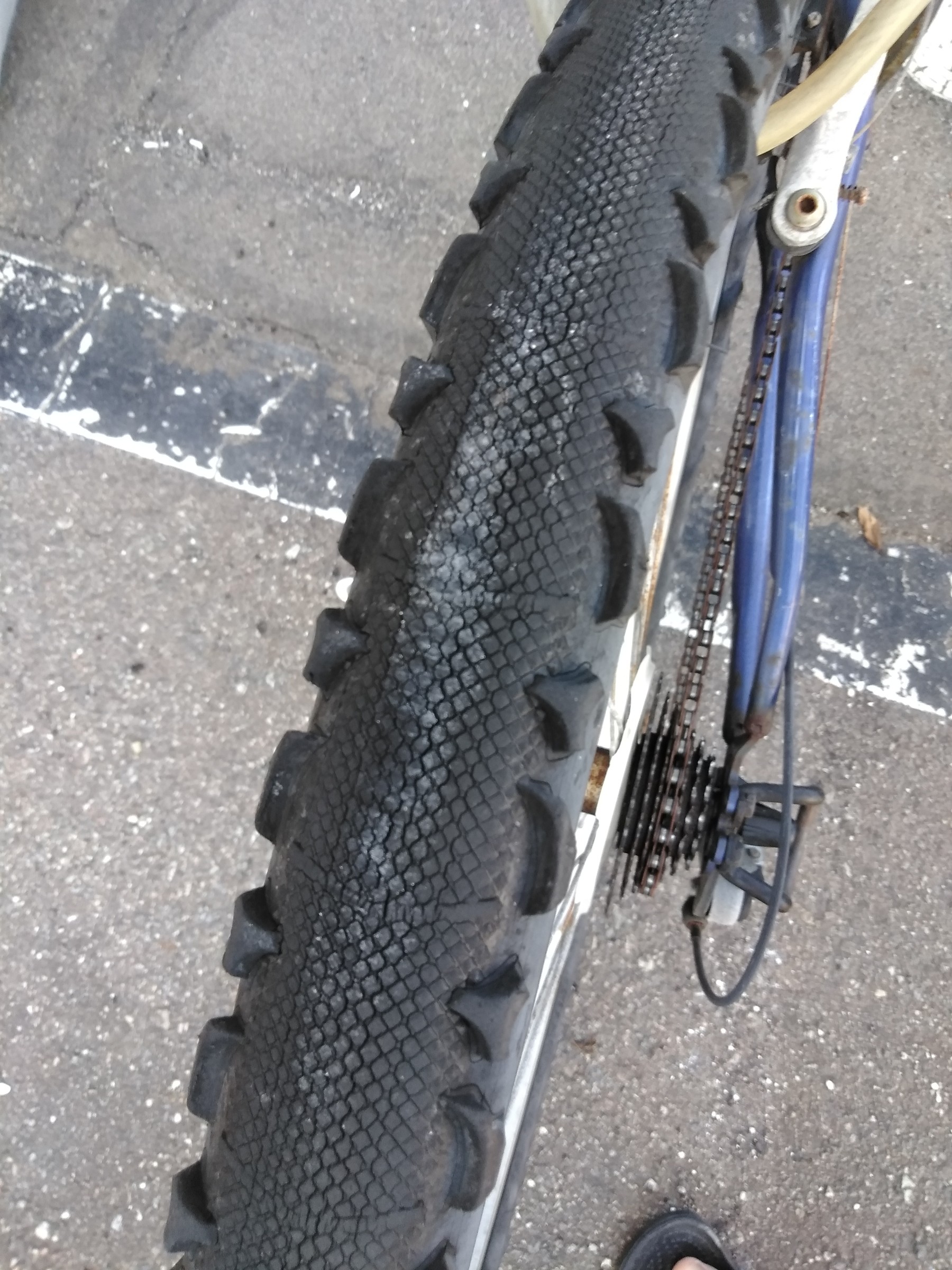 してみました。車のタイヤと同じで経年劣化によりひび割れがひどくてなり危険を感じて