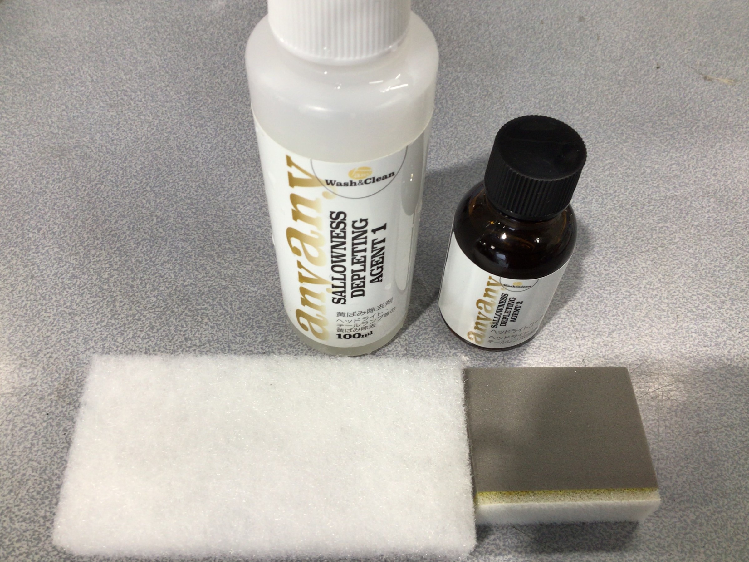 まずは、黄ばみを取るために特殊な液剤を塗ってこすります。
