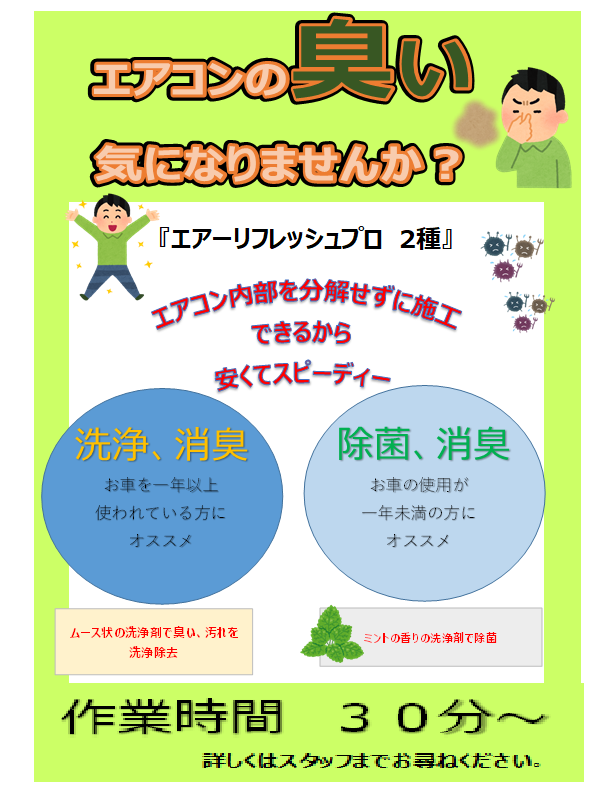 エアコン消臭除菌 エアーリフレッシュプロ ポスト エアコンの臭いが気になる方に是非! 臭いの元に直接アプローチ! エアコン内部を分解せずに 施工できるの待たずにリフレッシュ、 お財布にも優しいです! しっかり洗浄タイプとお手軽消臭タイプの 二種類から選べます! カテゴリ:商品情報 その他メンテナンス