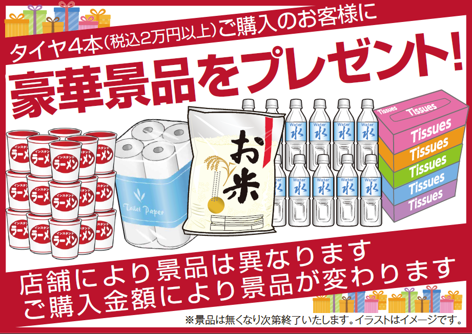 期間中タイヤ4本(2万円以上)をお買い上げの方には豪華景品をプレゼントいたします。