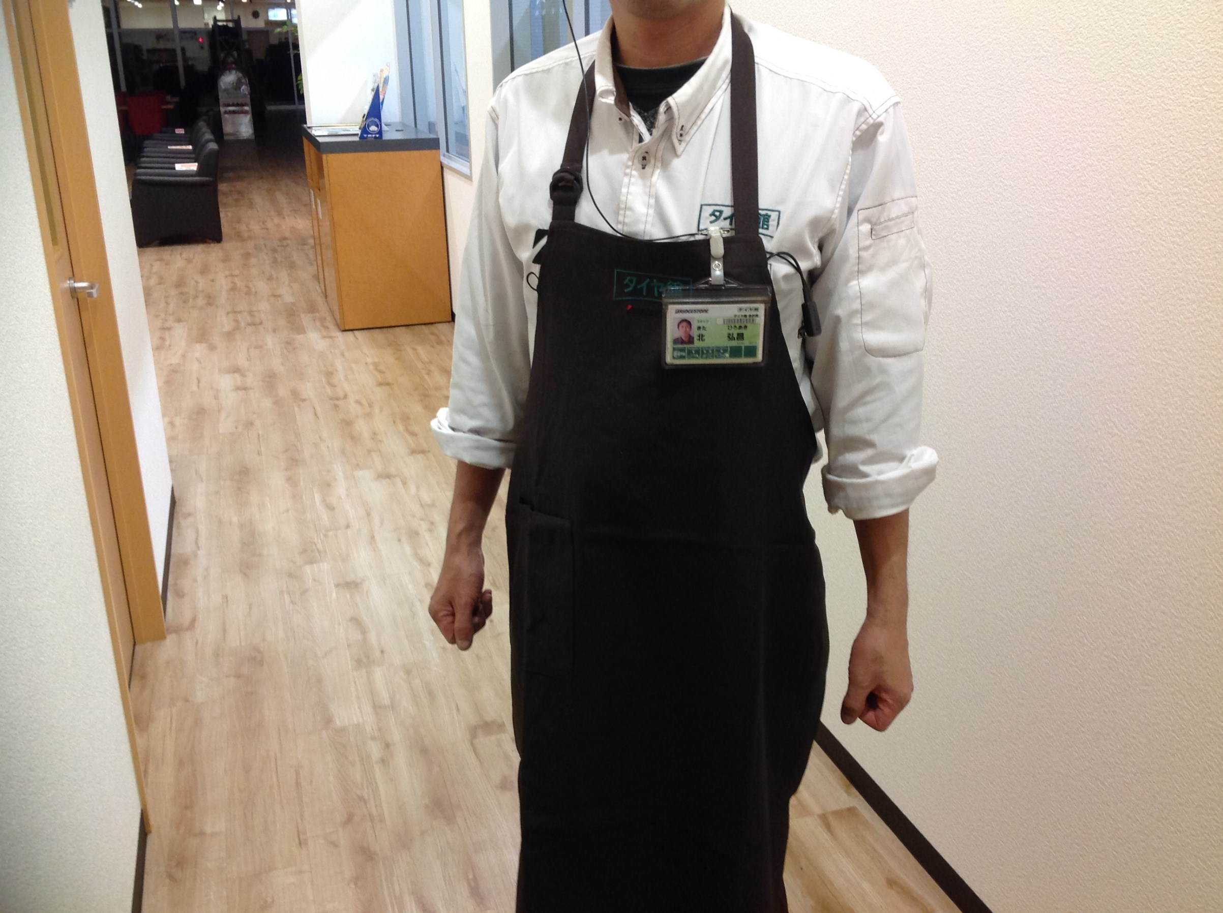 ズボンは茶色で、店のイメージカラーと同じ組み合わせです。