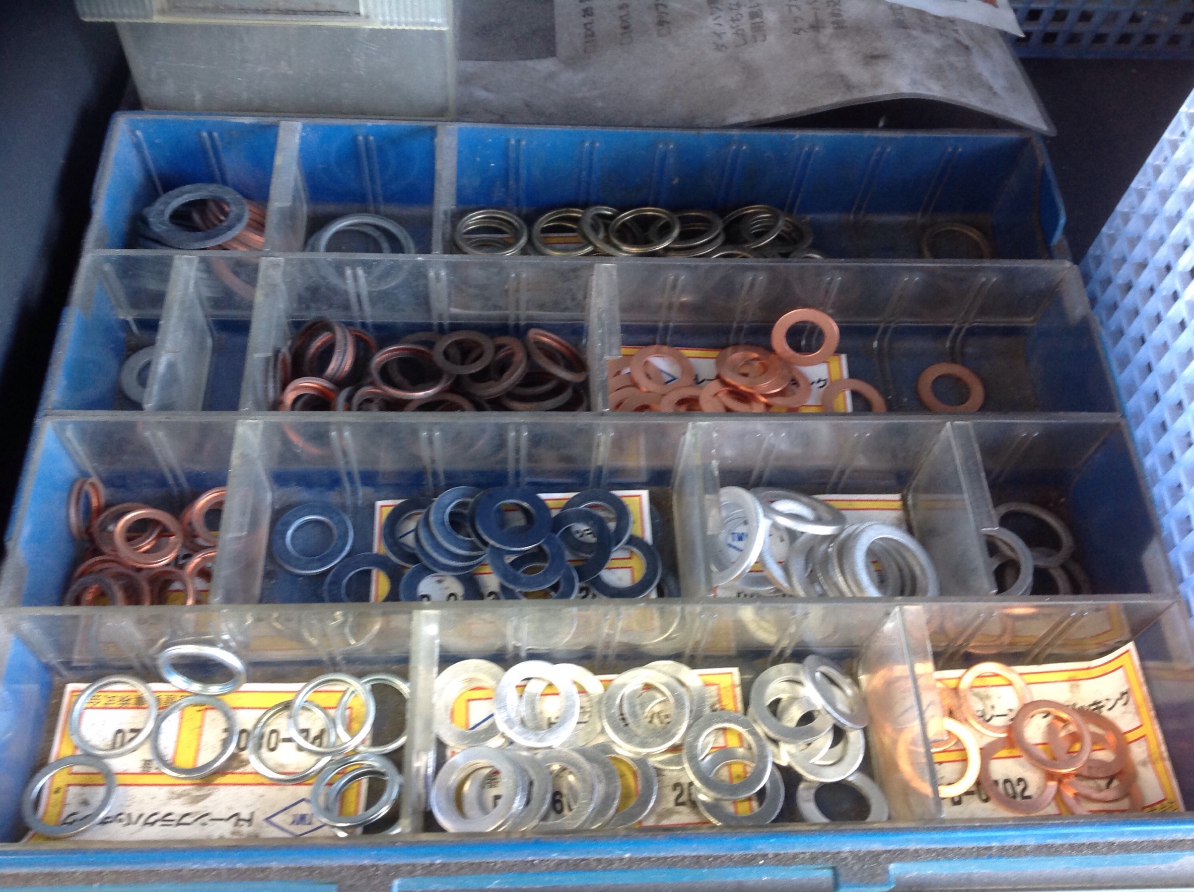 当店ではオイルドレンパッキンを使い回しせずしっかり新品に交換!車種によりサイズ形状が違うので一通り取り揃えています。当店でオイル交換して頂いた方は無料にて交換!