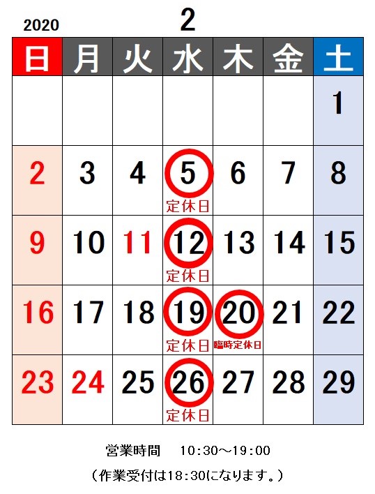 2月の定休日のご案内 ポスト 2020年1月28日 ☆★☆ 2月の定休日 ☆★☆ 5日 (水) 定休日 12日 (水) 定休日 19日 (水) 定休日 20日 (木) 臨時定休日 26日 (水) 定休日 ☆★☆☆★☆☆★☆☆★☆☆ 皆様のご来店を スタッフ一同心よりお待ちしております。 カテゴリ:お知らせ