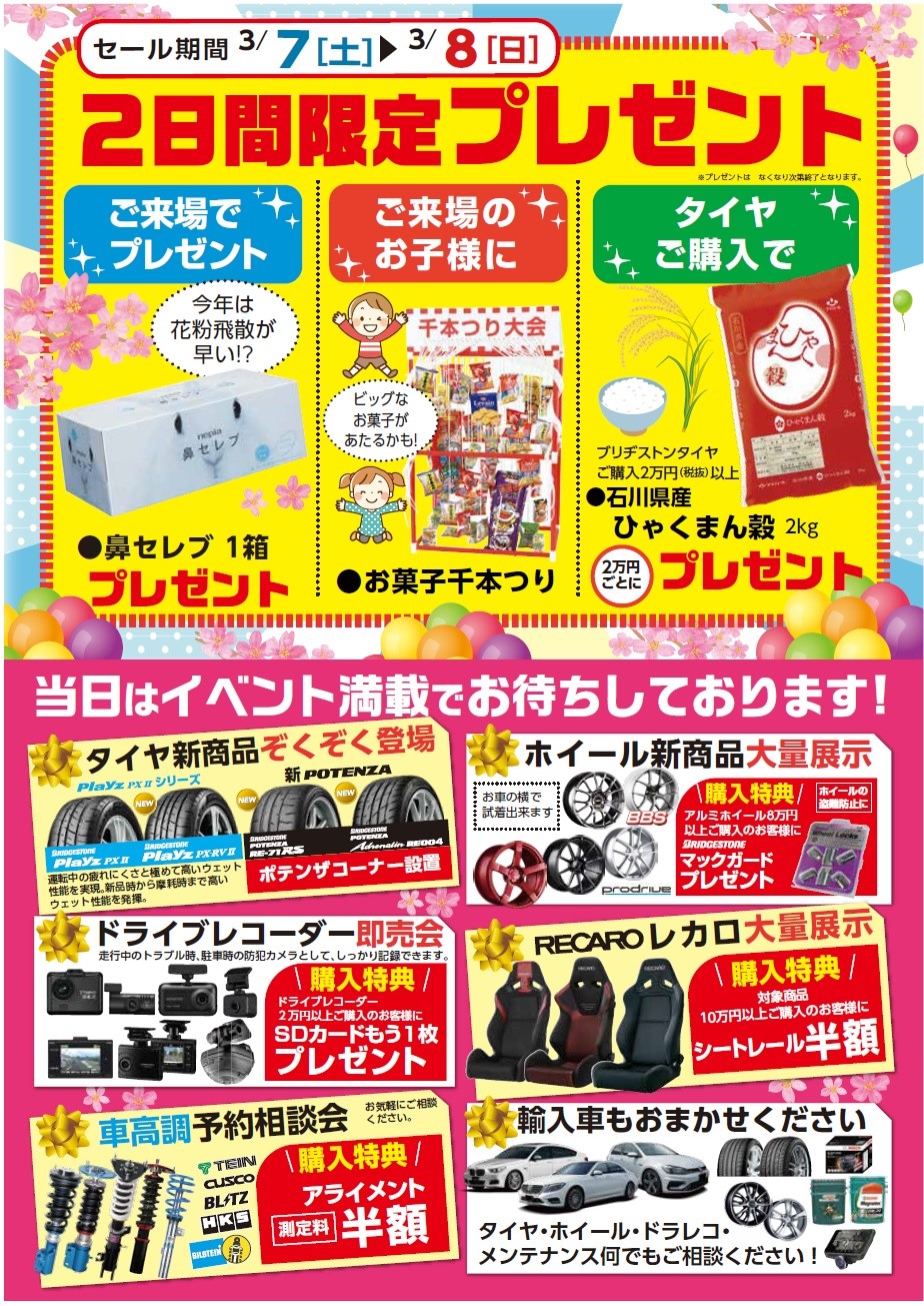 タイヤはもちろん、アルミホイールからなんでもお得になる二日間なので