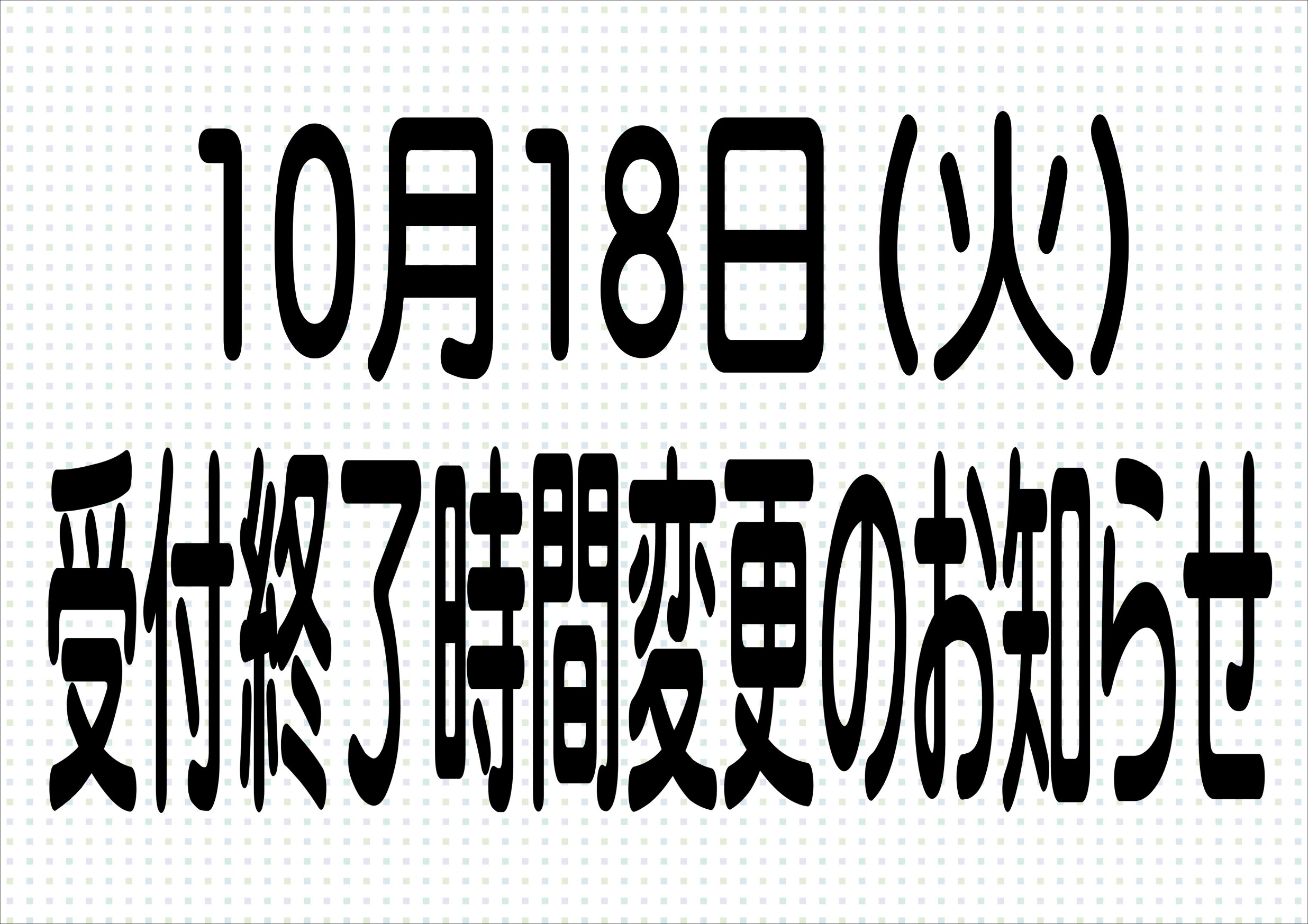 ★10月18日(火)の営業時間変更のお知らせ ポスト 2022年10月14日 いつもご利用いただき、ありがとうございます。 誠に勝手ではございますが、 10月18日(火)は、受付時間を午後2時半までとさせていただきます。 お客様には大変ご迷惑をおかけいたしますが、 ご了承いただきますよう、お願い申し上げます。 カテゴリ:お知らせ